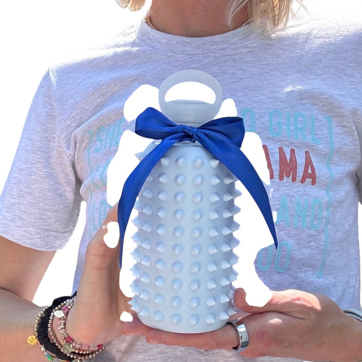 Introducing the Spiked Grace Little Bottle by bkr, where functionality meets fashion. With a 500ml (16 ounces) capacity, this reusable glass water bottle dons a Grace blue opaque silicone spiked sleeve, offering an innovative and protective barrier. Its compact design ensures it fits seamlessly into your tote, car, or backpack, becoming the ultimate everyday companion. Embrace sustainable hydration with a stylish edge, perfect for every lifestyle.