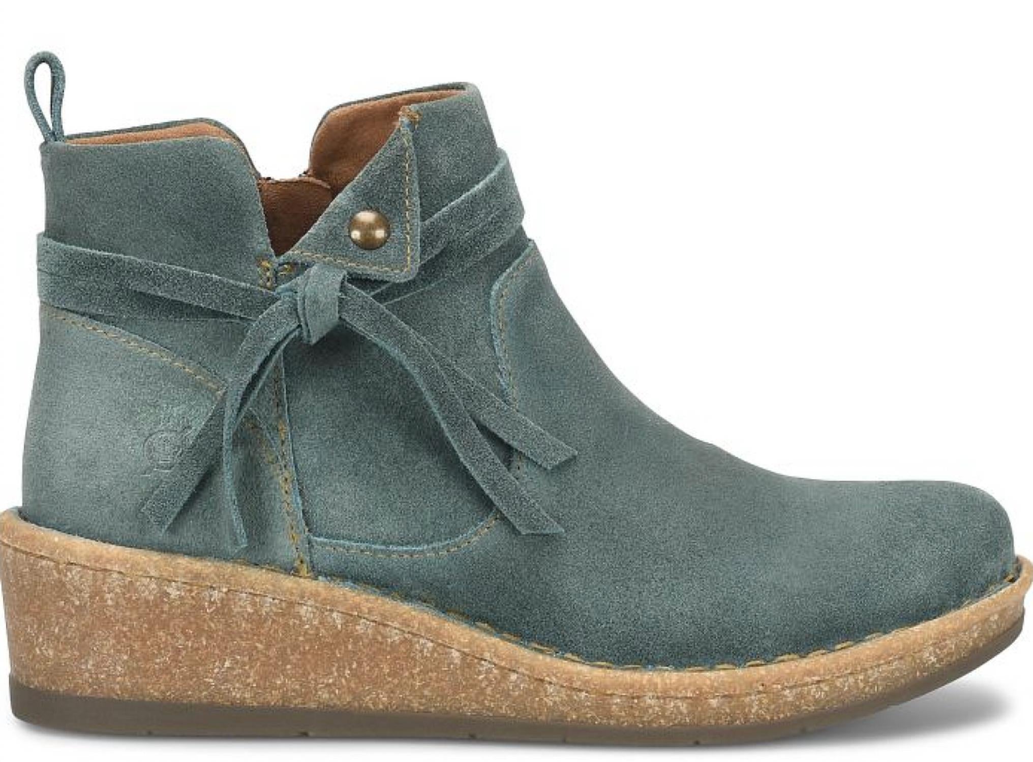 Say hello to the perfect, most versatile boot. The ankle height makes this style easily transition from day to night. Wear them with your favorite skinny jeans and tee for a more laid back look, or pair them with your favorite mini dress and jacket for a night out on the town. Step into the Women's Vaughn Distressed Suede Leather Bootie by Born, a striking choice for any Fall occasion. These teal booties feature a soft hand-finished distressed suede leather upper, complemented by a breathable leather lining. Enjoy the comfort of a cushioned microfiber-covered footbed with extra foam, and a high-traction lightweight rubber outsole, all united through 2-Way Opanka handcrafted construction. With a mid-platform heel height of 2 inches, these boots ensure style and comfort for everyday wear.