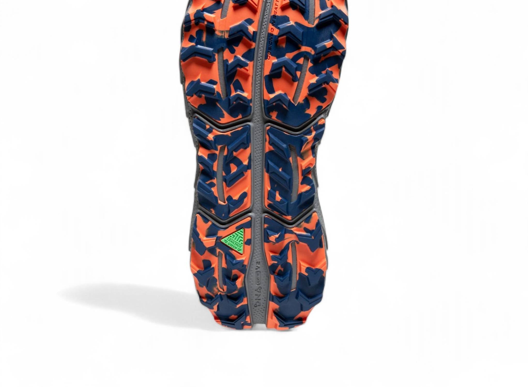 Introducing the MENS CASCADIA 17 TRAIL RUNNING SHOES by BROOKS in a striking BLUE/NAVY/FIRECRACKER combination. These athletic shoes are crafted with sustainability in mind, featuring 54.2% recycled materials in the upper, effectively diverting 9.42 plastic bottles from landfill. Designed for all-terrain performance, they offer enhanced traction, trail protection, and all-terrain stability with a protective toe cap and durable mudguard. With soft cushioning and a midsole drop of 8mm, these shoes weigh 11.0oz / 311.8g, making them lightweight yet robust for trail running. Ideal for adults, featuring a wide shoe width and round toe design.