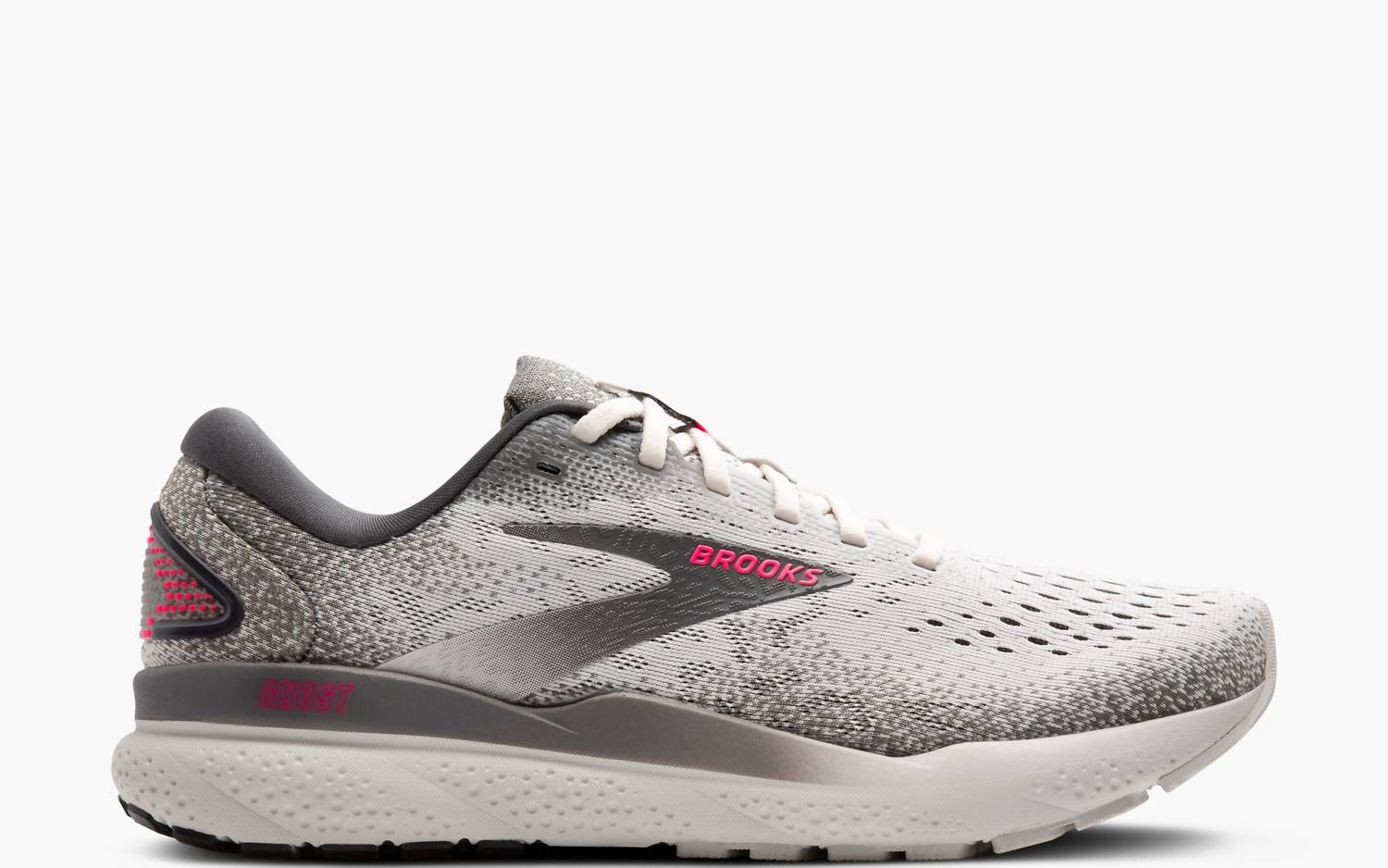 When fashion meets function. Introducing the Women's Ghost 16 Shoes by BROOKS, crafted for optimal athletic performance. These shoes feature a round toe shape, providing a comfortable fit for women. Made with durable rubber, they come in a sleek white, grey, and estate blue color combination. Perfect for any fitness enthusiast looking to enhance their running experience.
