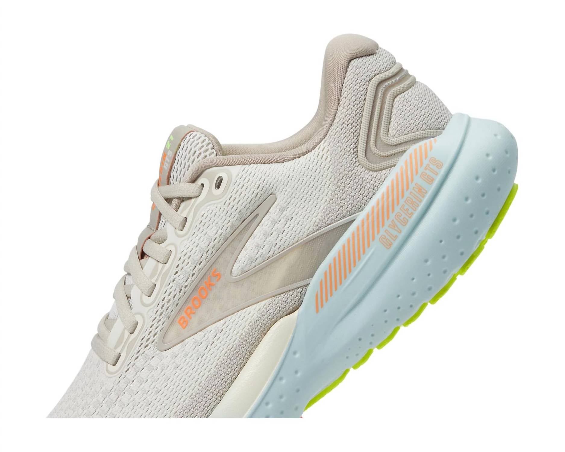 When fashion and function come together seamlessly. Experience the ultimate in comfort and support with the Women's Glycerin GTS 21 Running Sneakers by Brooks in a stunning colorway. These sneakers feature an engineered warp knit upper paired with a lace-up closure, offering a snug and secure fit. Enhanced with nitrogen-infused DNA LOFT v3 and GuideRails technology, they provide weightless softness and unrivaled support that adapts to your natural stride. Imported with a nylon lining and road tack rubber outsole, these sneakers boast a cushioned feel with a 10mm heel-to-toe drop, ensuring maximum comfort during your runs. Weight: 10 oz.