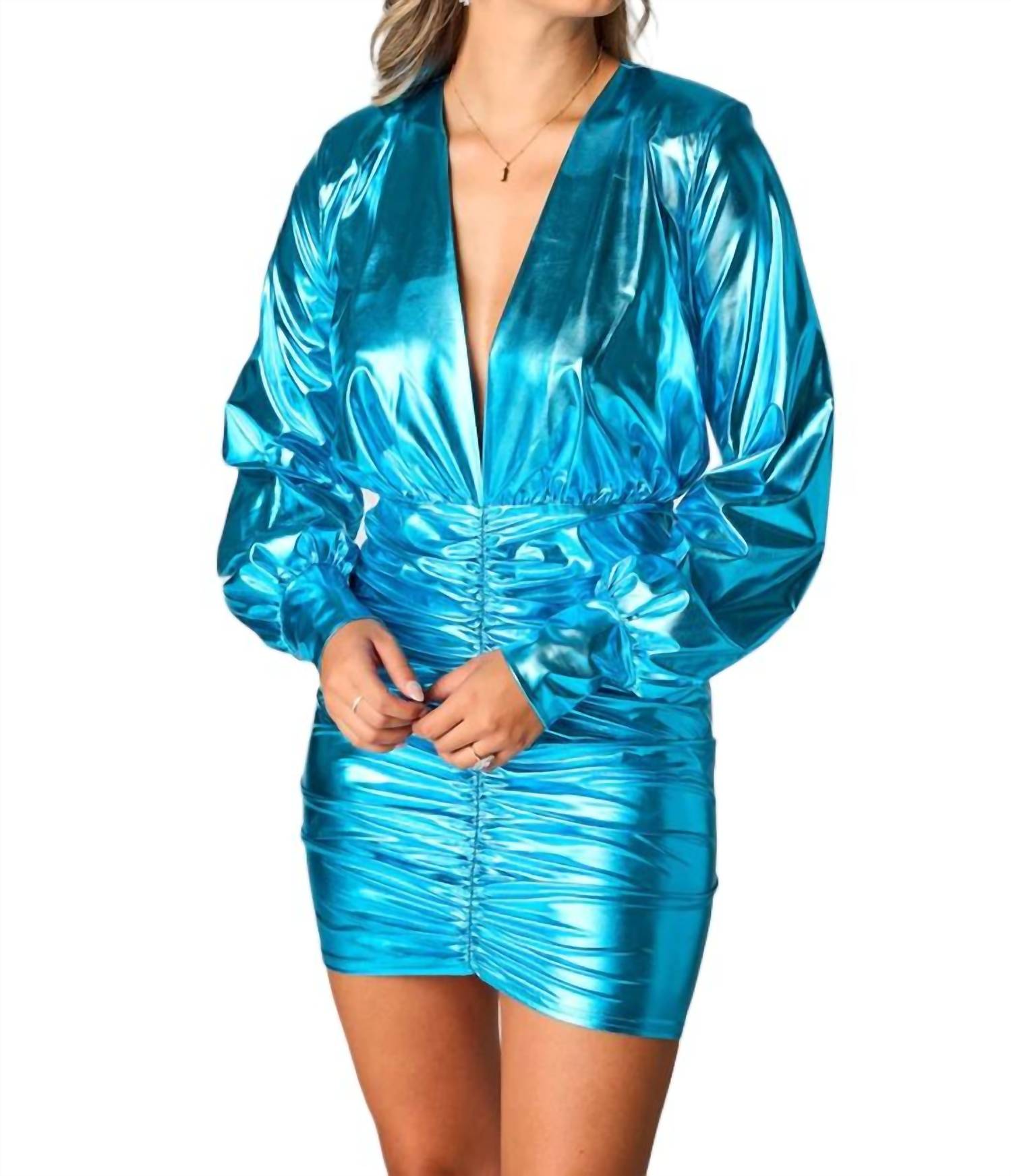 Bodycon style. Mini length. Stretch on lower half. Plunging V neckline. Loose long sleeves. Cuffed. 96% Polyester. 4% Spandex.