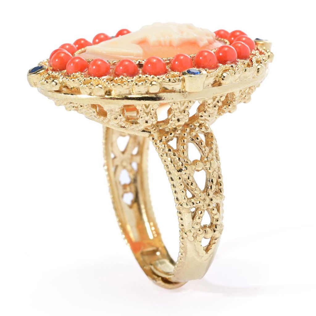- Coral: Features a white/orange shell cameo cut in an oval shape (16x12mm), along with 20 round cabochon cut red coral stones (2mm each) and 4 brilliant cut blue cubic zirconia stones (1.75mm each).