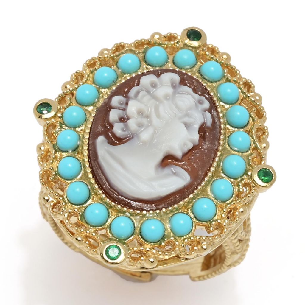 - Turquoise: Adorned with a white/brown shell cameo cut in an oval shape (16x12mm), complemented by 20 round cabochon cut turquoise paste stones (2mm each) and 4 brilliant cut green cubic zirconia stones (1.75mm each).
