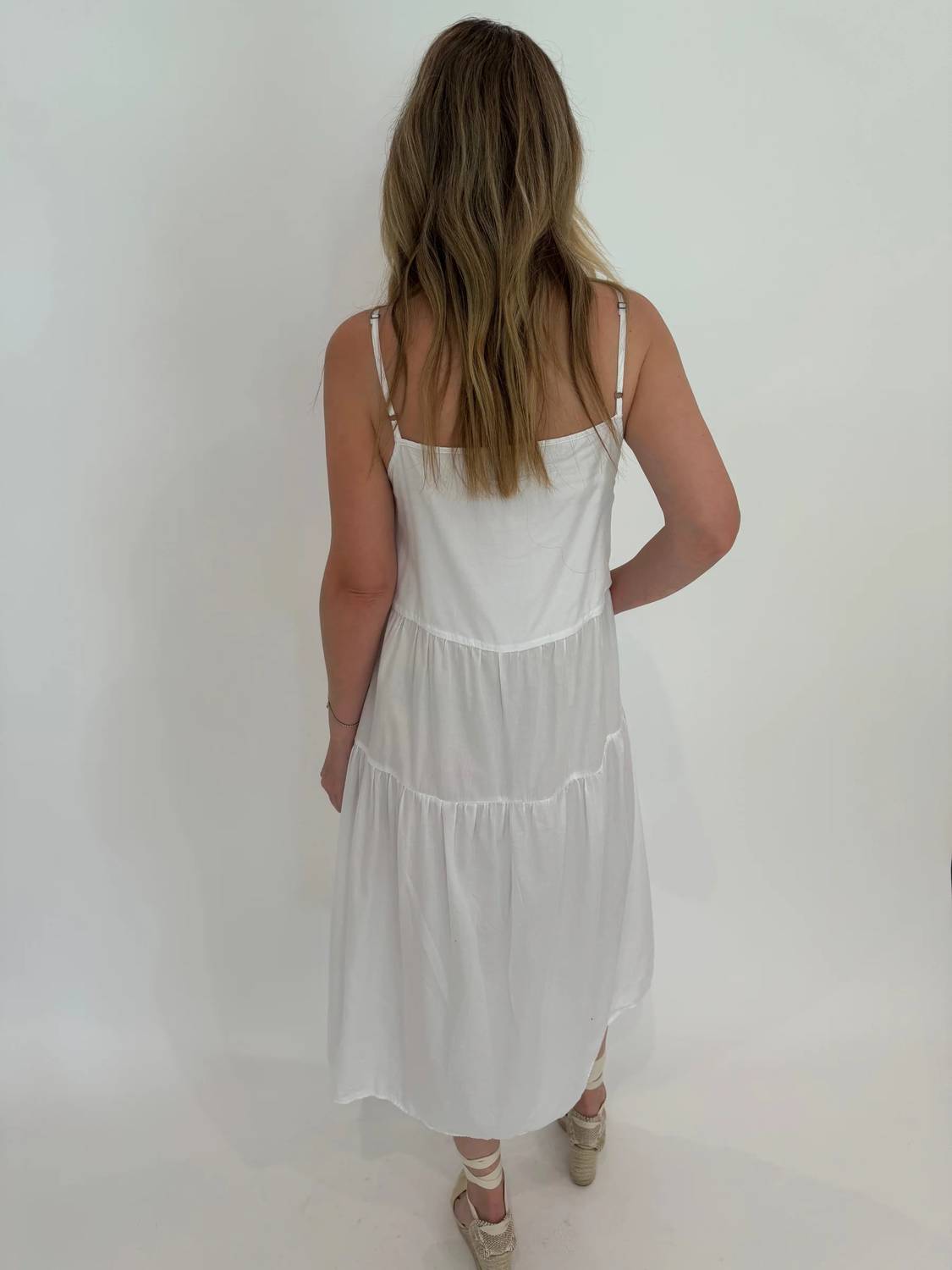 A midi dress so versatile, your options for wearing it are endless. Discover the Cool Cotton Strappy Tier Dress by Enza Costa, a chic and breathable choice for warm days. This white midi dress is sleeveless with a square neckline and features thin adjustable straps for a customized fit. Crafted from lightweight cotton, it offers functional pockets and an A-line silhouette, ensuring both comfort and style. Closure: Pull on for easy wear.