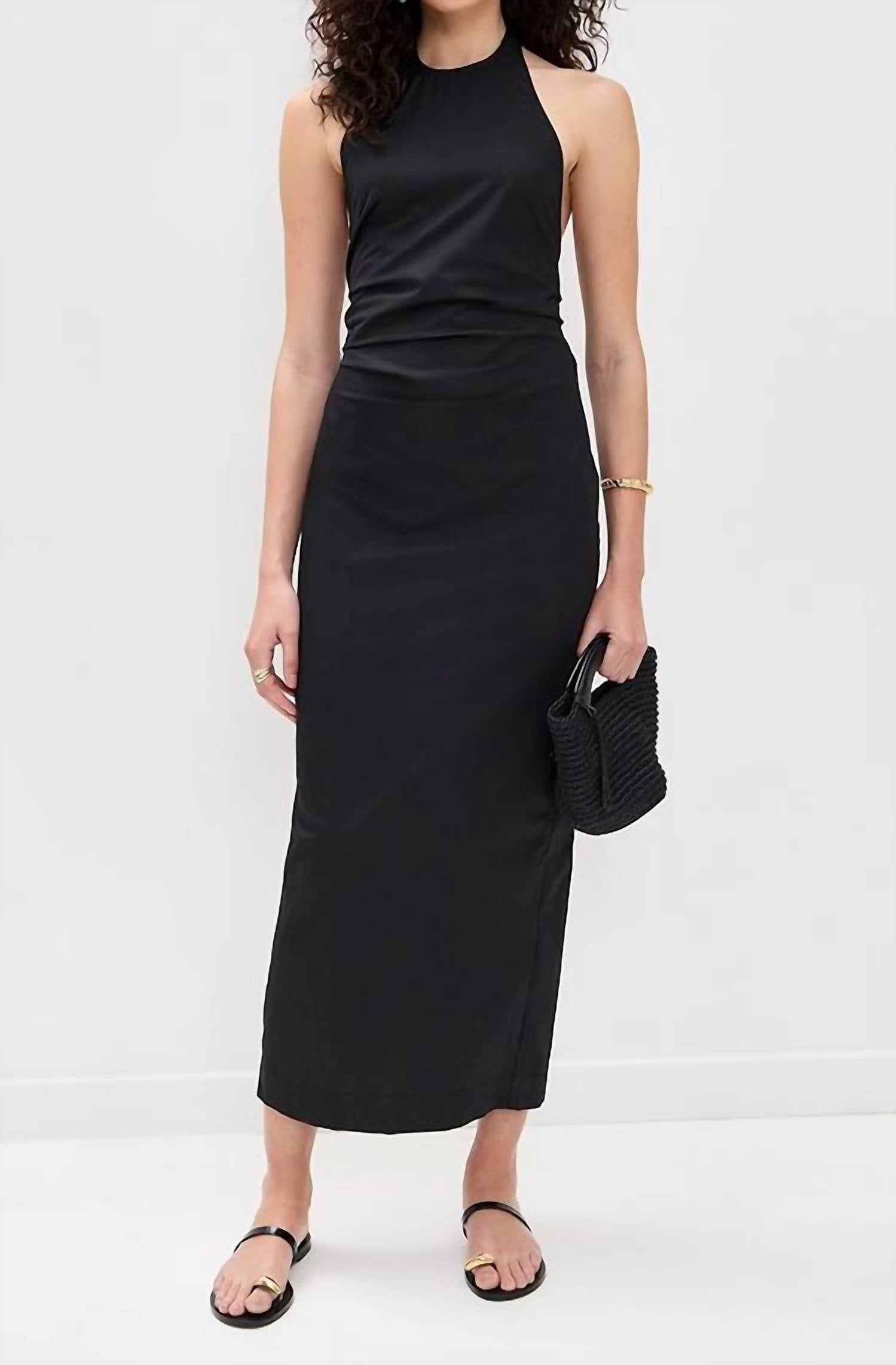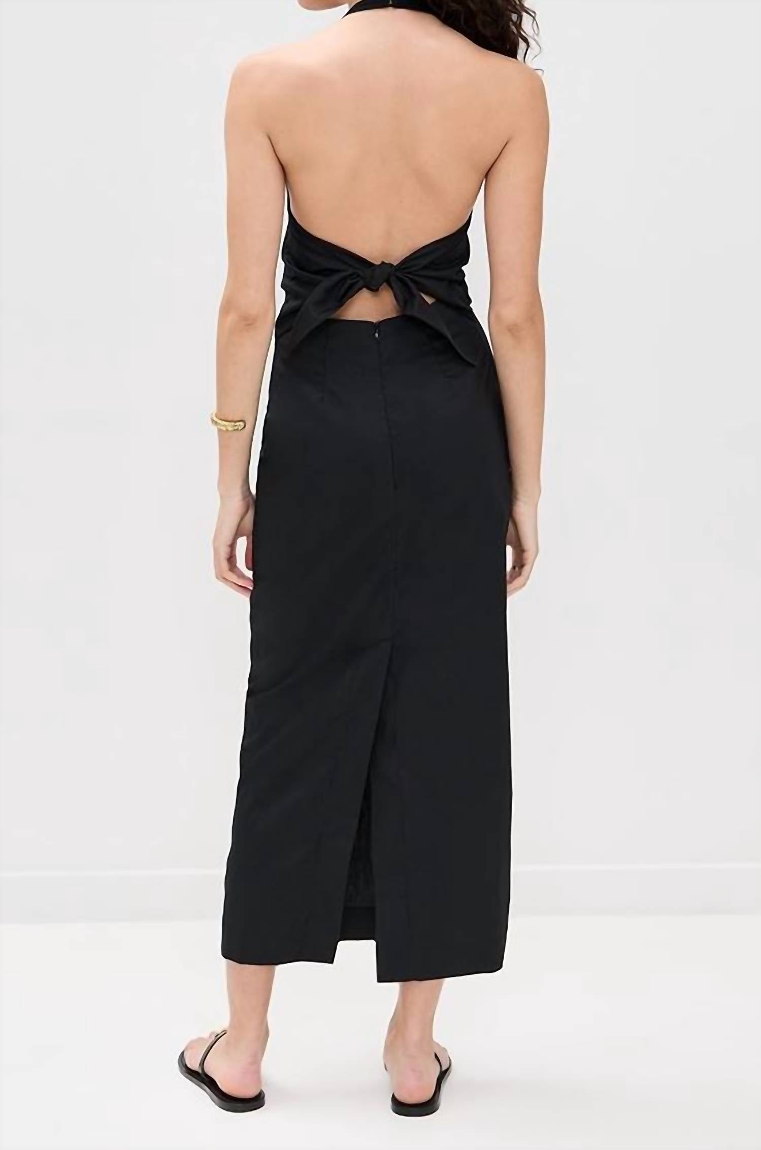 Style this maxi with your favorite statement necklace and sandals for the perfect look. This sleeveless sheath dress is crafted from 100% cotton poplin, ensuring a structured and smooth finish. With an ankle-skimming 53.25" length and a halter neckline featuring a tie-back detail, it provides an adjustable fit for effortless elegance. Made in the USA, it features a hidden back zip closure and is recommended to wash cold for maintenance.