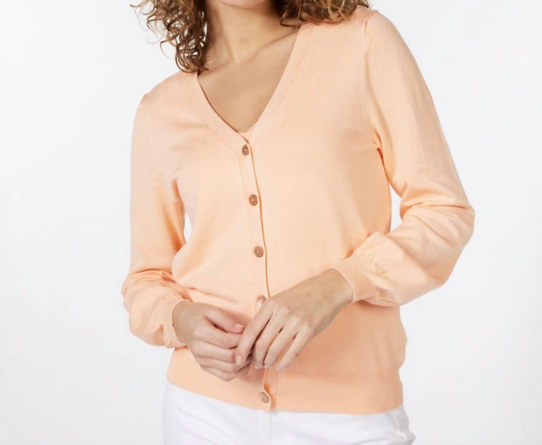 Throw this adorable cardigan over any cami or tank top. Introducing the Basic V-neck Cardigan by ESQUALO, a timeless piece in a soft peach hue that's essential for any wardrobe. This women's cardigan features long sleeves with ribbed detailing on the sleeves and hemline, offering a textured look whether buttoned up or left open. Crafted from a viscose blend, its composition is 78% viscose and 22% nylon. Closure: Button closure.