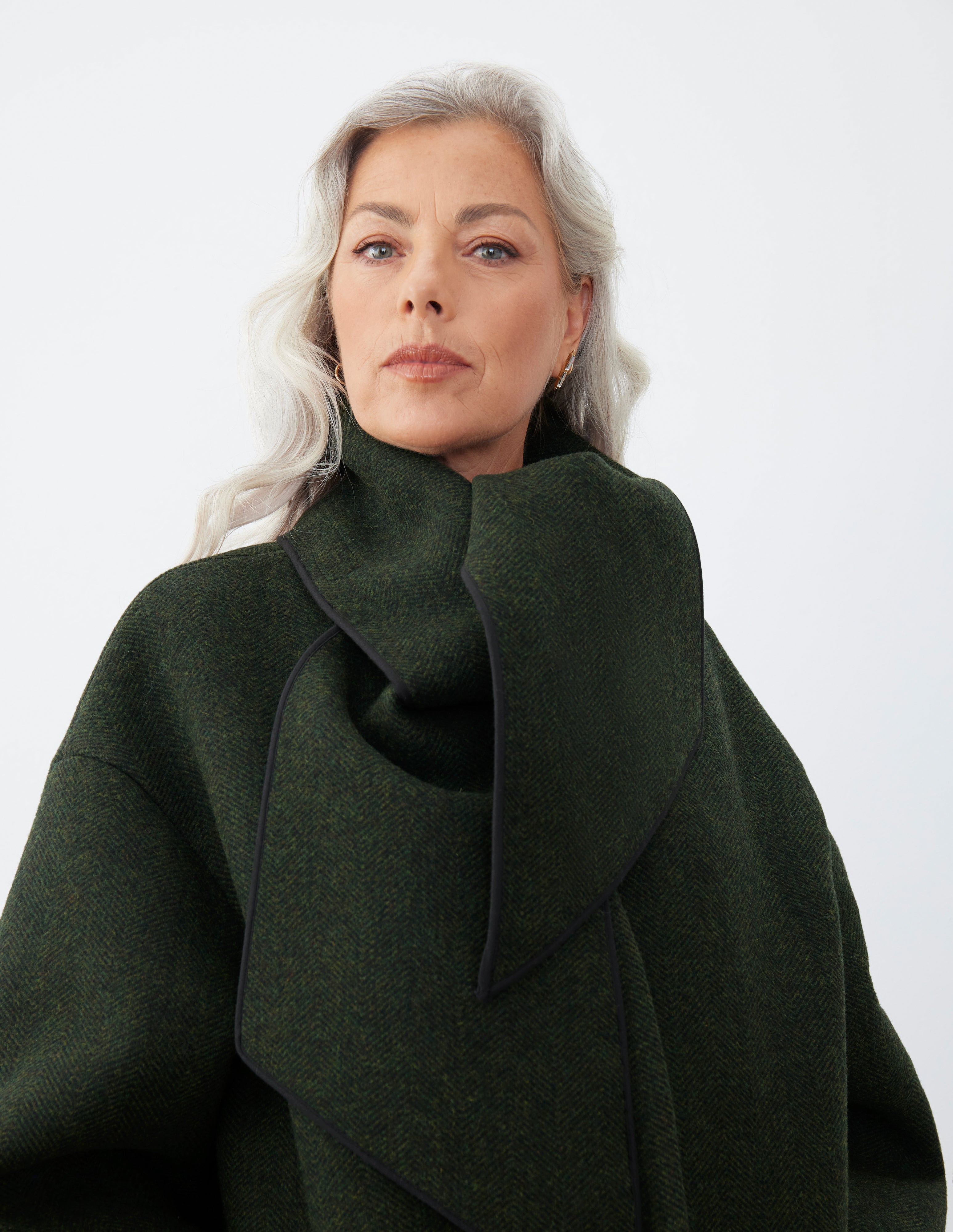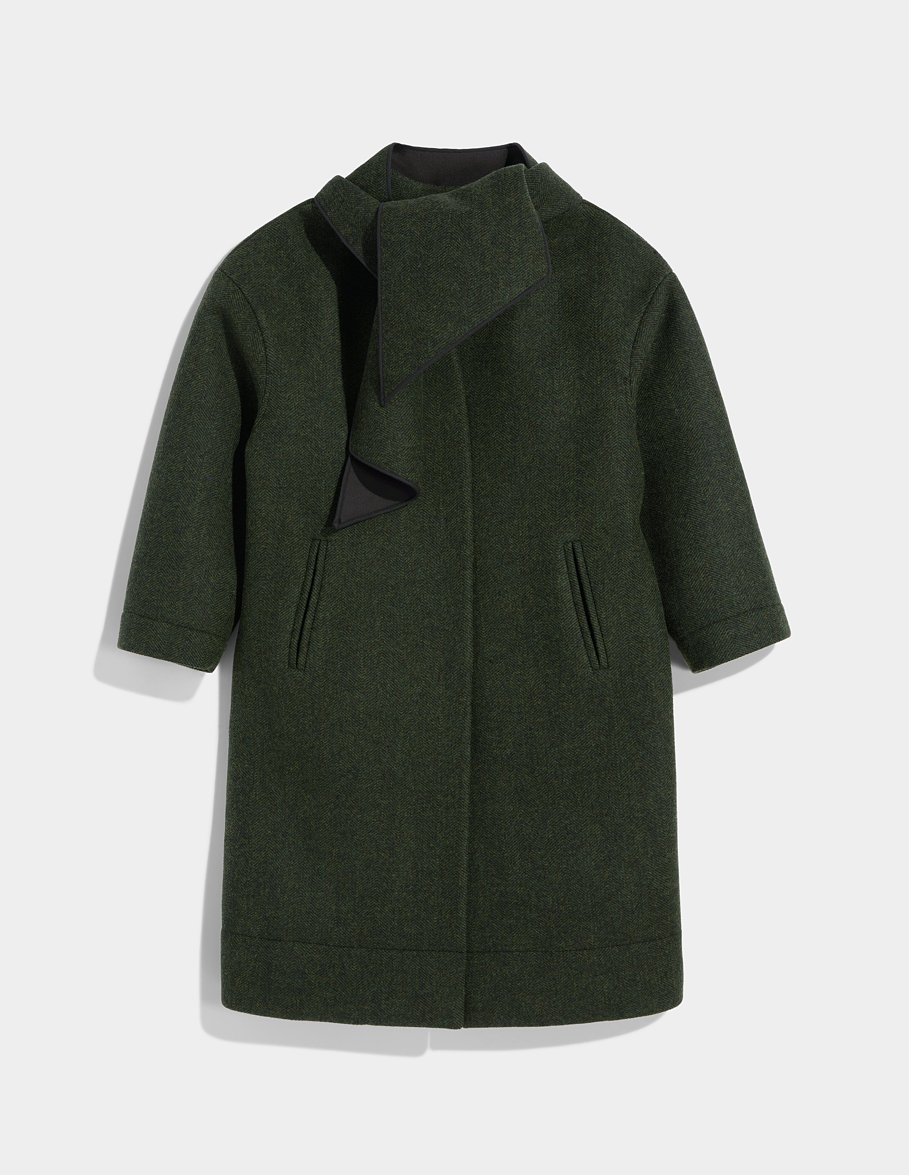 With a detachable scarf and iconic herringbone, this double-faced wool exterior with recycled polyester interior coat is sleek and chic all at once.