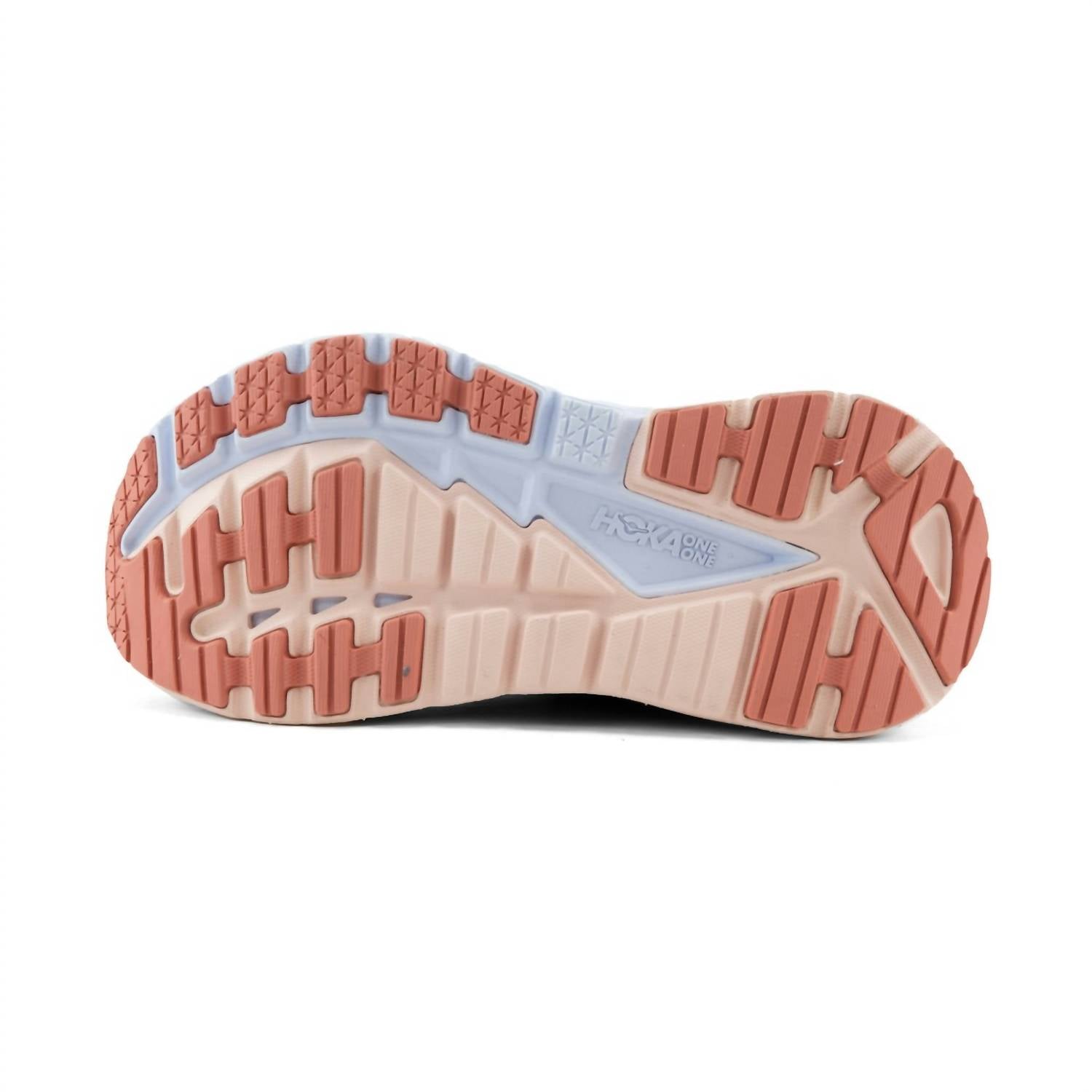 Workout in style with these adorable athletic sneakers. Introducing the Women's Gaviota 3 Running Shoes by Hoka, a perfect blend of stability and plush comfort in a stylish Ombre Blue/Rosette color. Designed with engineered mesh for breathable comfort, these athletic shoes feature a supportive Midfoot H-Frame and the innovative J-Frame™ for rebound and durability. Enjoy inherent stability with flat-waisted geometry and an additional last stage Meta-Rocker for a smooth toe-off. Heel height is 29 mm, forefoot height is 24 mm, with a 5 mm offset, these wide-fit athletic shoes are ideal for fitness/workout enthusiasts seeking top performance.
