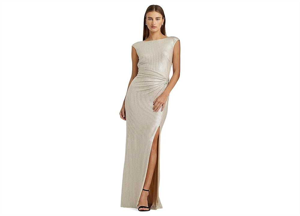 Make a glamorous entry into any party or event wearing the LAUREN Ralph Lauren Metallic Sleeveless Gown. Featuring gathered pleats with a rhinestone-embellished pin at the left waist, this metallic gown offers an eye-catching appeal. The sleeveless style, boat neckline, and bust darts add to its style and comfort. Fully lined for better coverage, this long gown is crafted from a polyester elastane blend that offers superior comfort and a flattering drape. The dramatic side slit of the dress heightens its allure. Flaunt your curves and great fashion wearing this floor-length gown. The column silhouette and concealed zippered back closure with a hook-and-eye closure complete the look, making it suitable for any elegant occasion.
