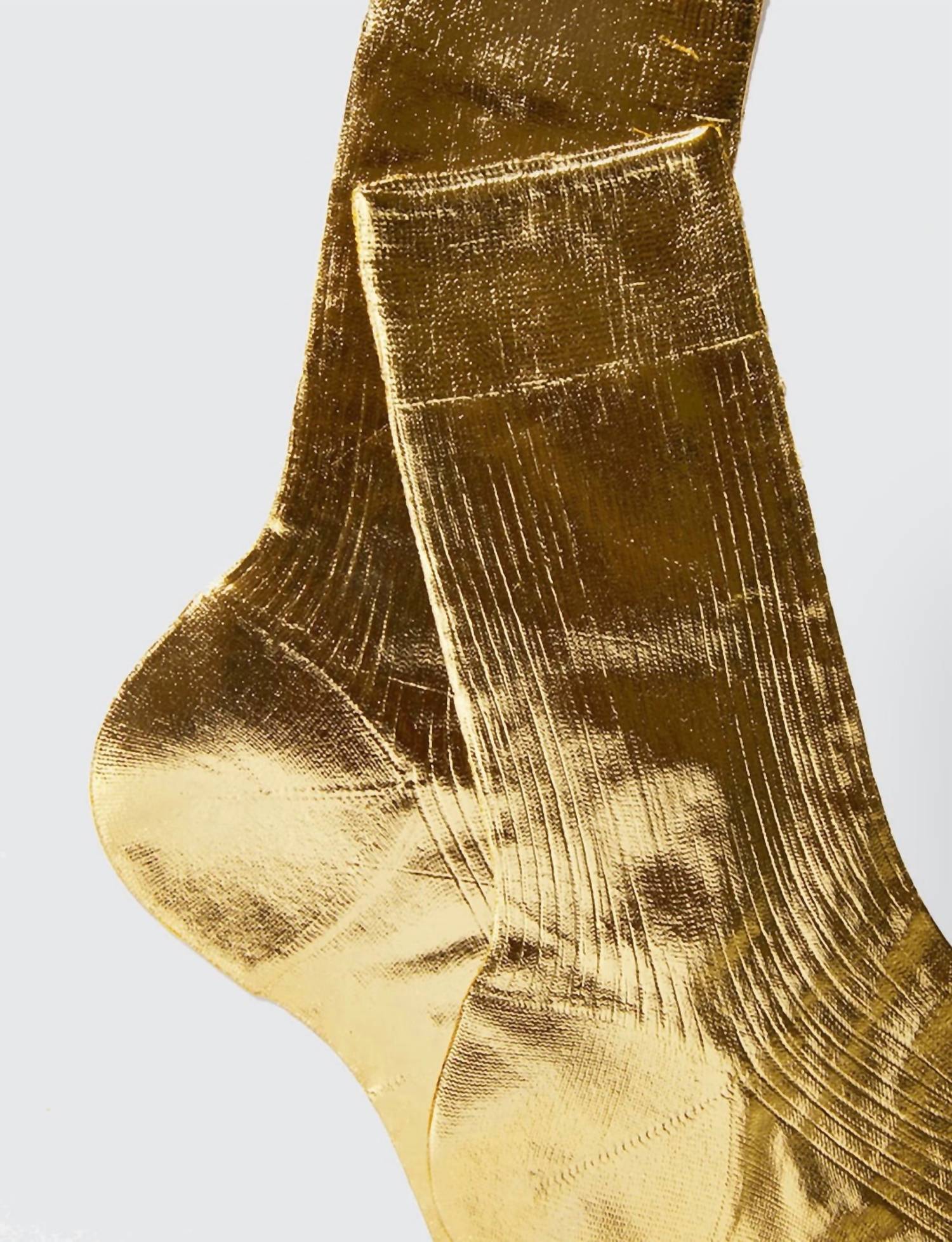 Essentials you'll need in every color. Designed for comfort and style, these are the perfect addition to any outfit. Keep your feet cozy and fashionable in these all season long. Elevate your style with the Women's One Ribbed Laminated Metallic Socks by Maria La Rosa, crafted from an exquisite blend of 66% silk and 34% polyamide. These gold textured socks feature a unique insulating quality, perfect for maintaining comfort through seasonal changes. Made in Italy, they offer a delicate metallic finish that gently fades, unveiling silk's subtle natural sheen. Designed for minimalist elegance, they're ideal for adding a touch of sophistication to any travel wardrobe or special occasion. Care: Hand wash and line dry.