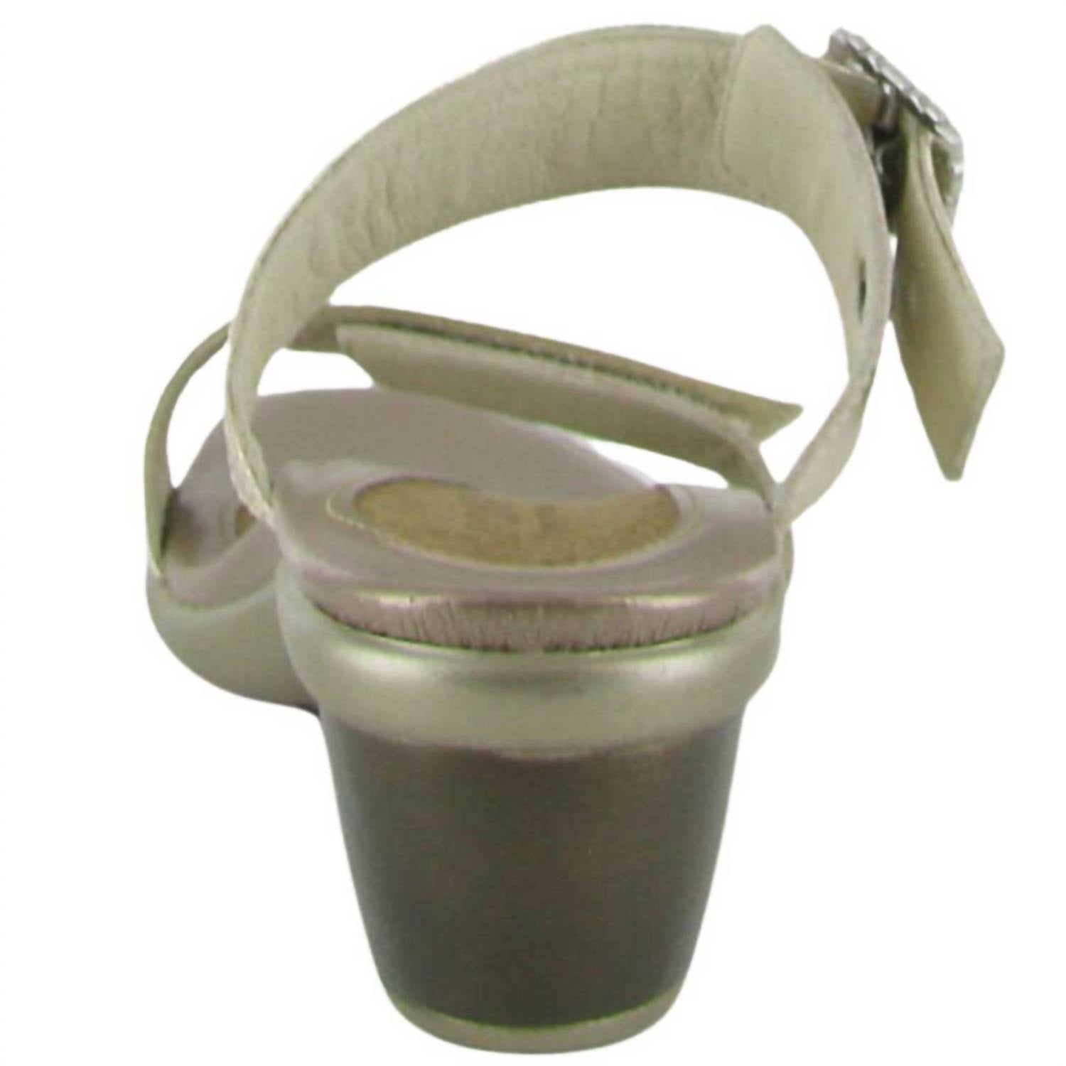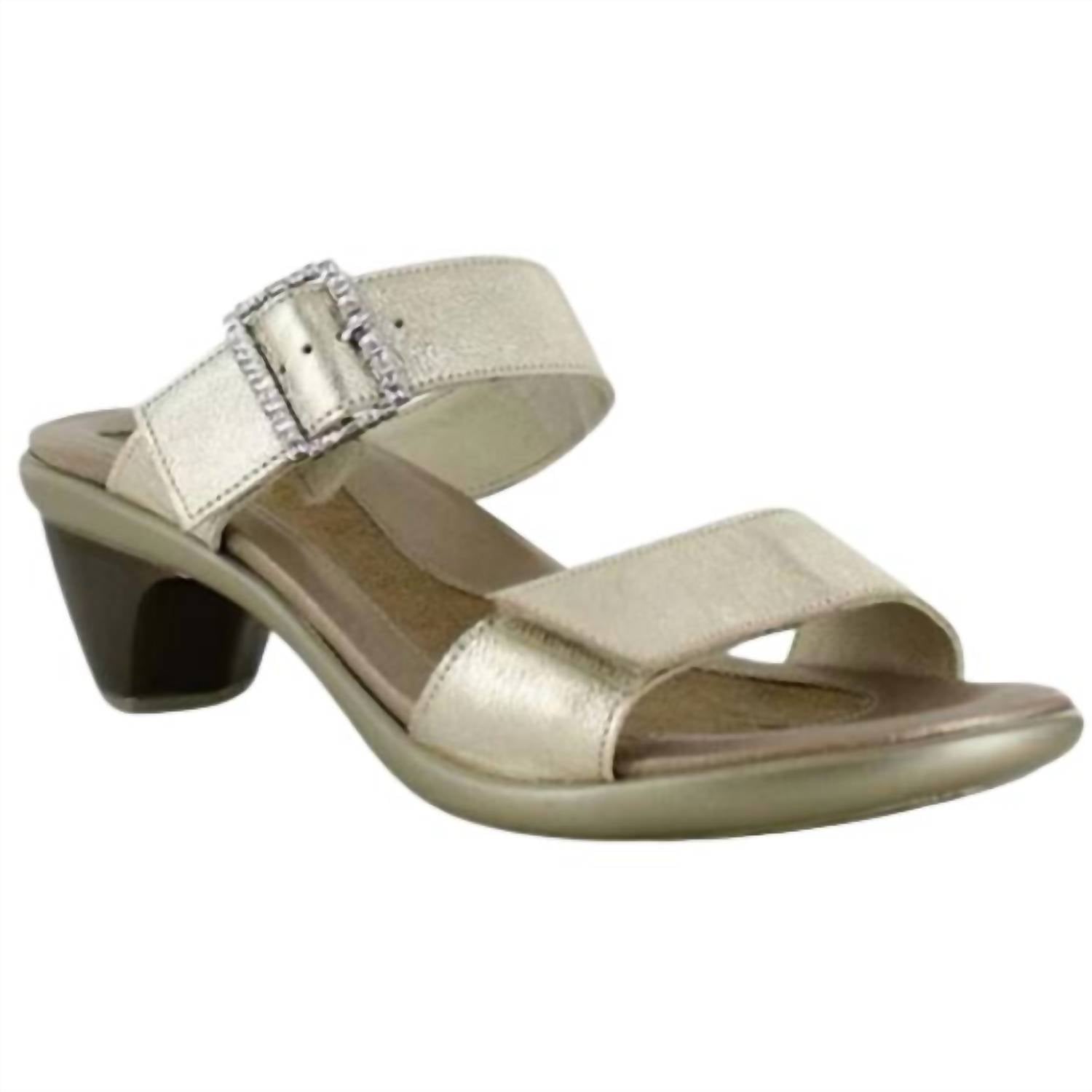 The perfect height for day to night. Elevate your ensemble with the Women's Recent Heeled Sandal by NAOT, a dazzling addition to your footwear collection. These sandals feature a stylish 2" heel and are crafted with a captivating gold radiant leather upper. The secure fit is ensured by a hook and loop ankle strap, complemented by a jeweled buckle on a padded front strap. Sole material is durable Thermoplastic Rubber, designed for those true-to-size fits, while the medium width guarantees comfort and stability, making it a chic yet practical choice for various occasions.