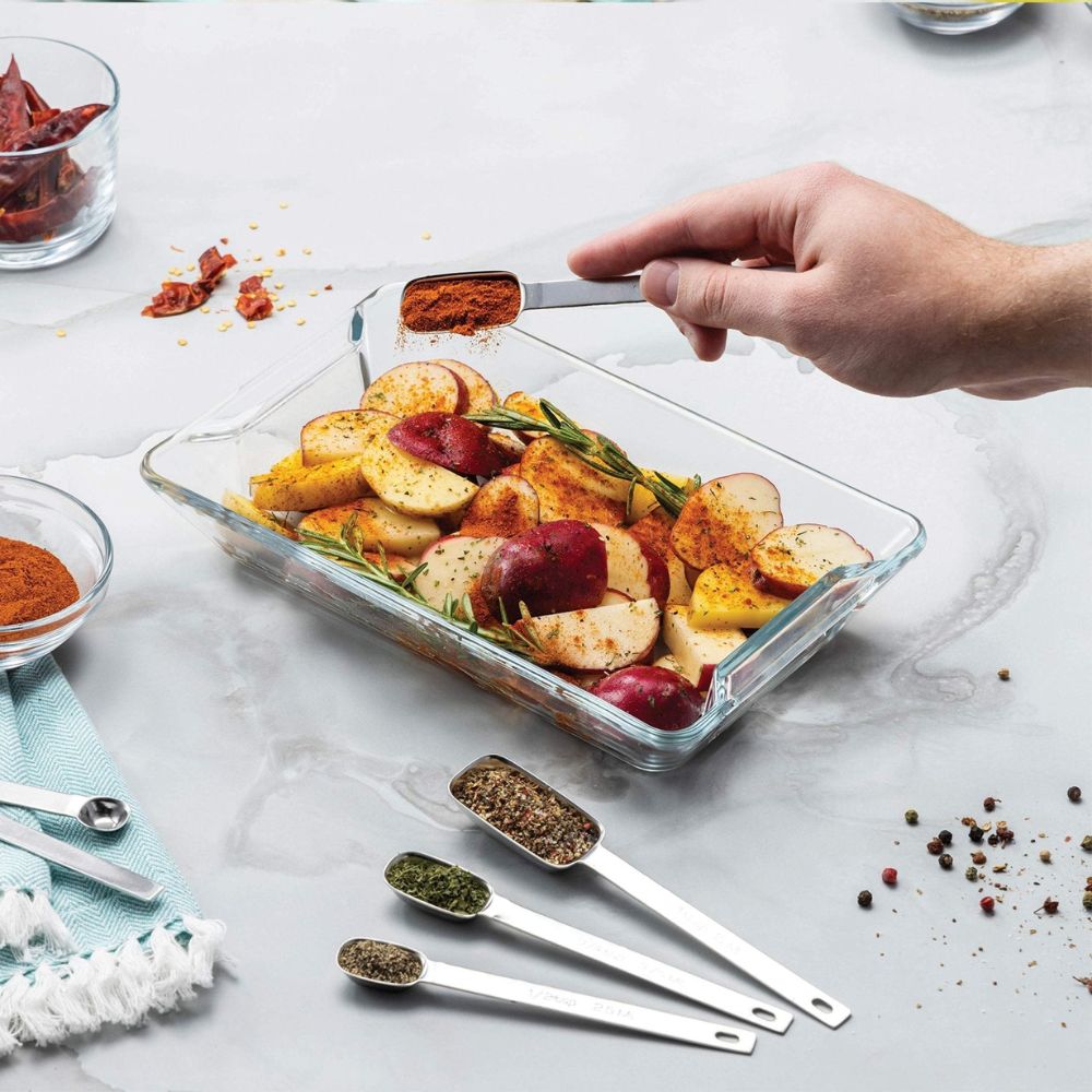 - SPACE SAVING - The measuring spoons neatly nest inside each other and come with an ergonomic O-ring for compact, organized storage. The tilted handles enable them to be independently set down.