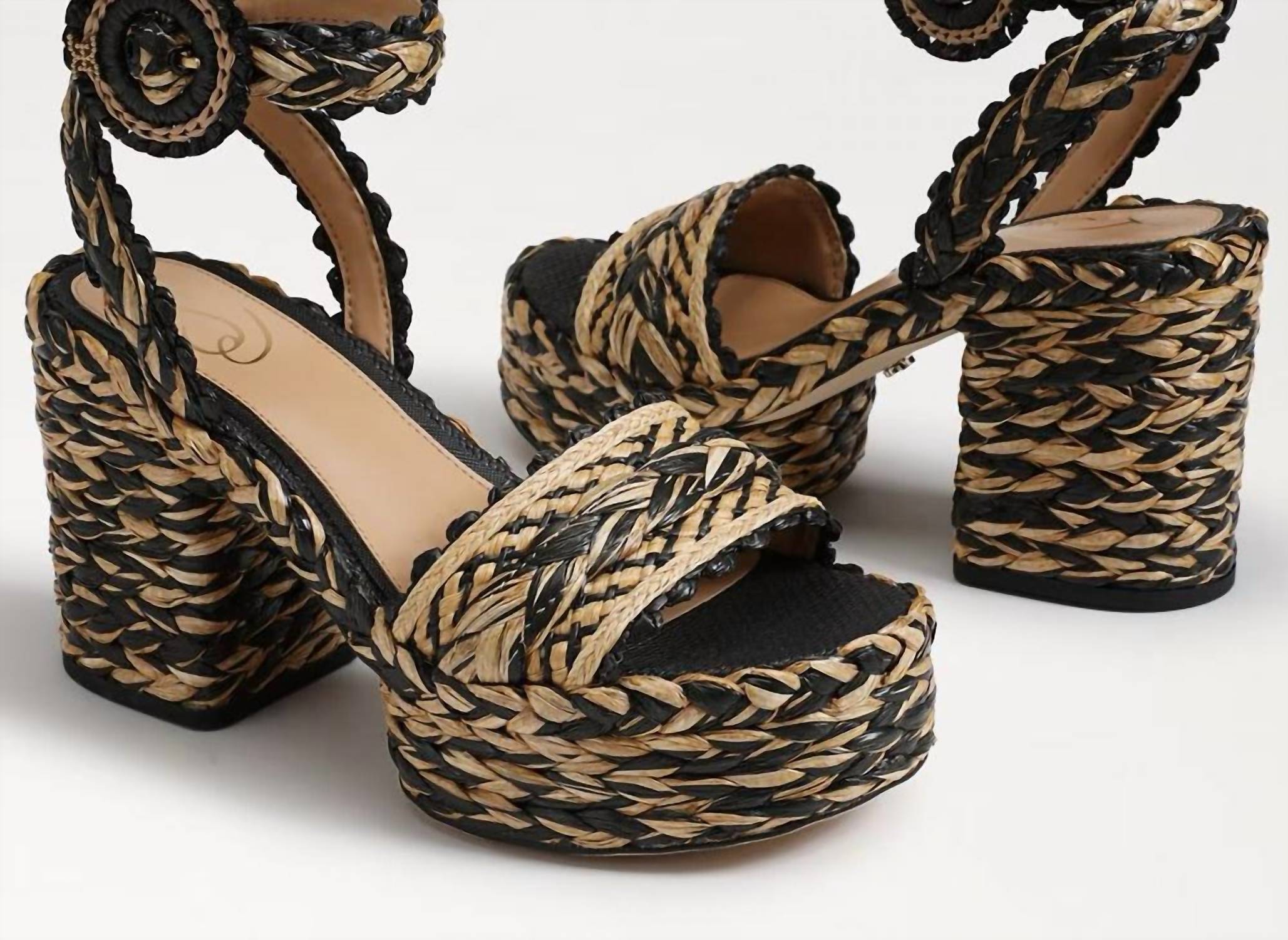 Step up your style. Feature a braided woven design. Comfortable 4-inch block heel and a 1.25-inch platform. Offer a designer lift to your ensemble. Secure buckle closure and fabric material are paired with a synthetic insole for added comfort. Ideal for any adult looking to enhance their high-heeled collection.