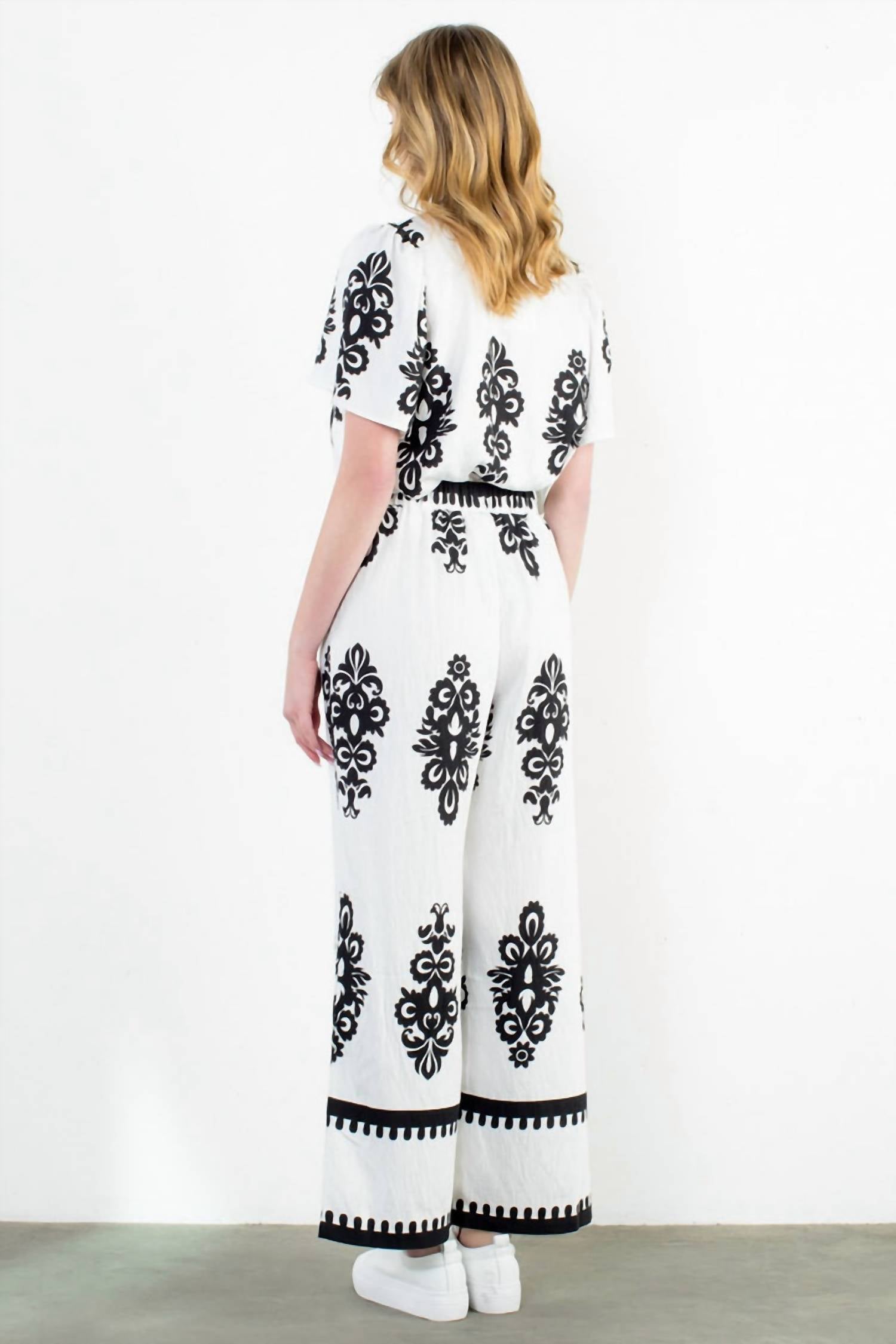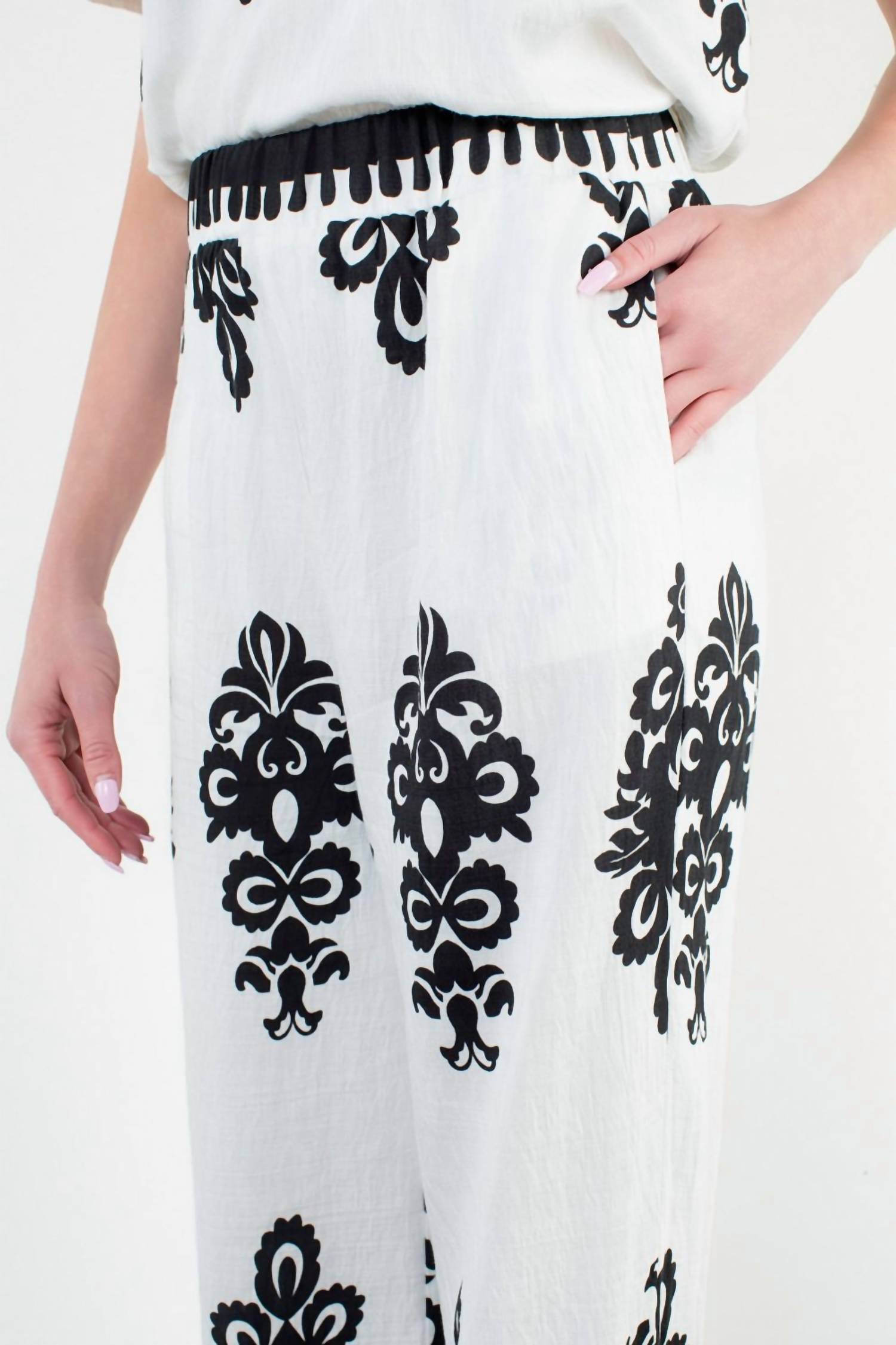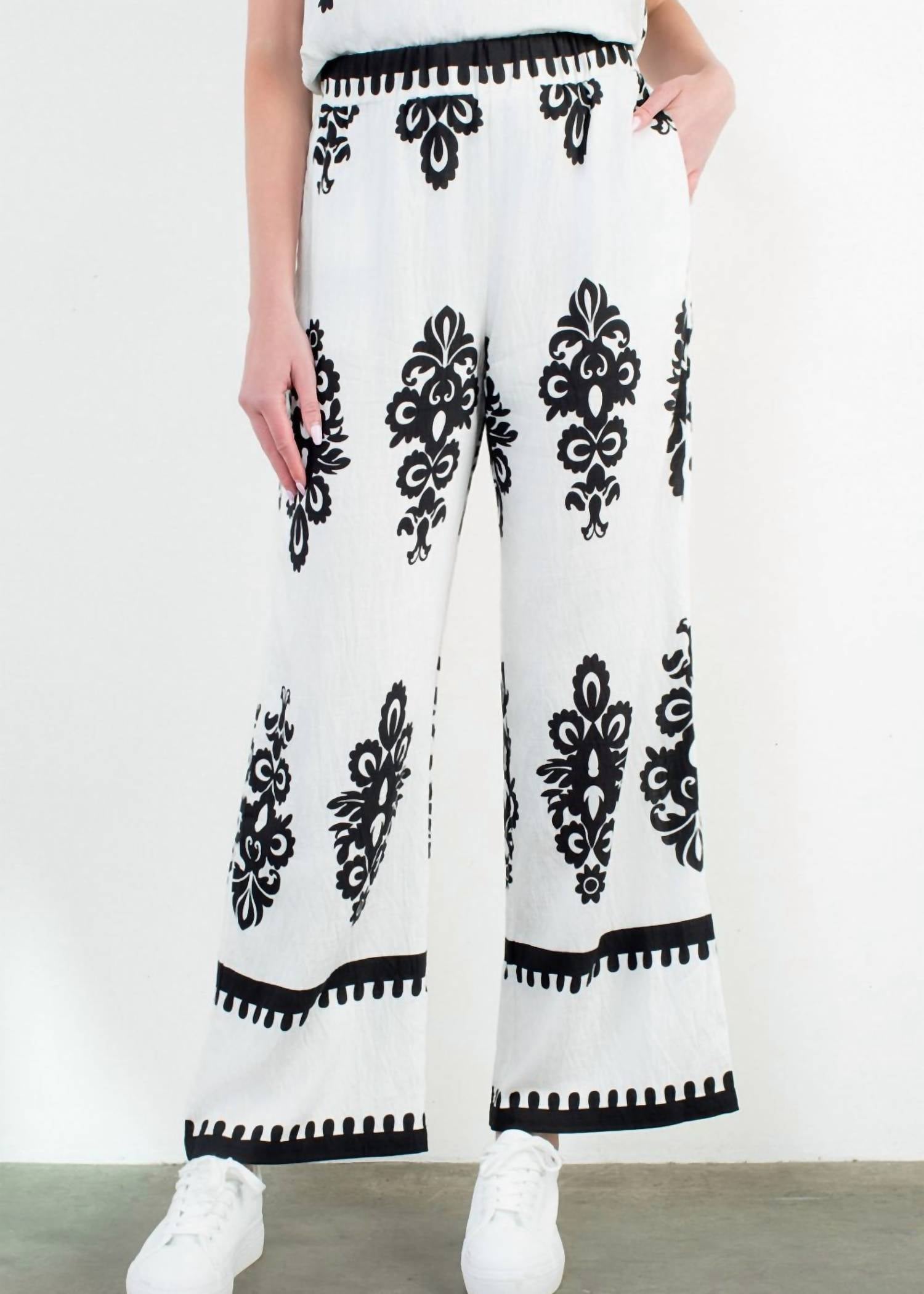 Elevate your summer wardrobe with the THML Wide Leg Print Pants, designed for a boho chic appeal and perfect for Easter gatherings. Featuring a comfortable fit, these patterned pants are crafted in the USA from a blend of 83% rayon and 17% nylon. The casual pull-on closure and handy pockets enhance ease of wear, accentuating their wide leg silhouette. Embrace the festive season in style with these statement-making white pants.