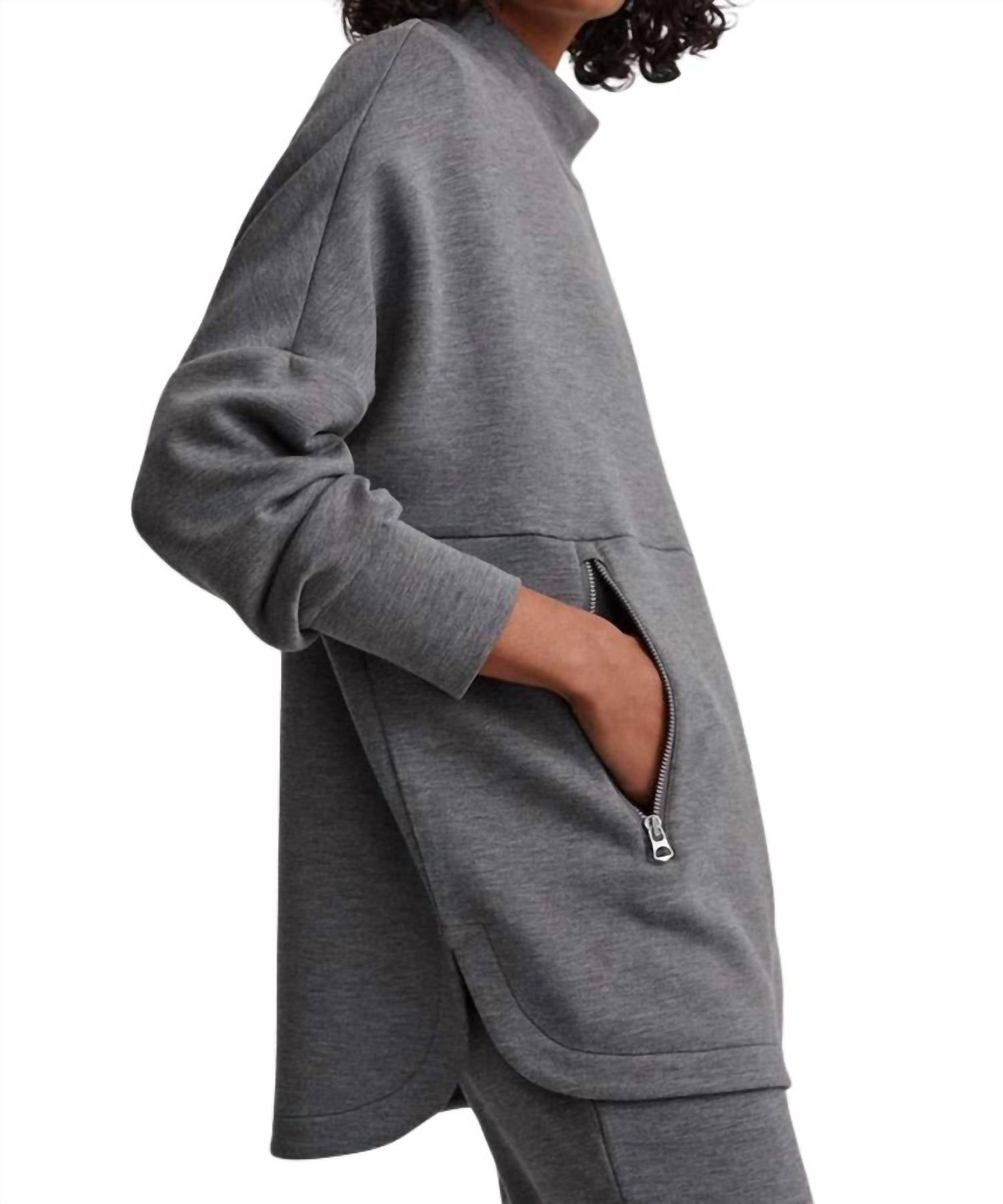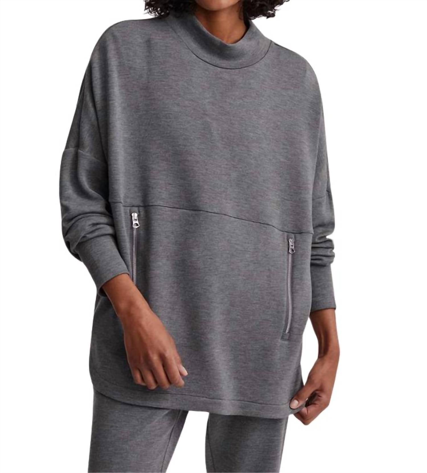 Whether you're running around town or lounging at home, this sweatshirt works for both. Presenting the Longline Mock Neck Sweatshirt by VARLEY, a stylish choice for women that pairs perfectly with any streetwear ensemble. This pullover in a solid charcoal hue features a mock neckline, long sleeves, and is crafted from 72% viscose, 23% polyester, and 5% elastane. The design includes two zippered pockets for practicality, complemented by a straight hemline with curved side slits. Care for this trendy piece with machine wash and tumble dry, making it the ideal choice for an effortless yet chic look.