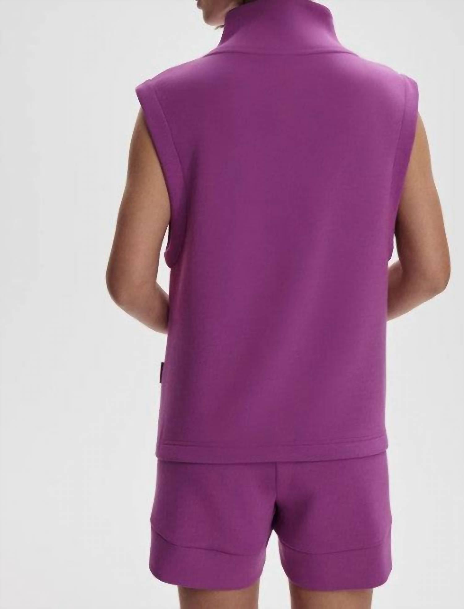 Fit, fabric and functionality. This tank top checks all the boxes. The Varley Magnolia Half Zip Tank in Striking Purple brings a chic silhouette to your summer wardrobe with its high neck and sleeveless design. This tank features a stylish half-zip closure and subtly raised armholes for a modern update. Crafted from an 81% viscose, 15% polyester, and 4% elastane blend, it offers a comfortable fit with a front length of 23.6" for size S. Care for this piece by machine washing at 30°C with zippers closed, turning it inside out before washing, drying flat, and ironing at a low temperature if necessary.
