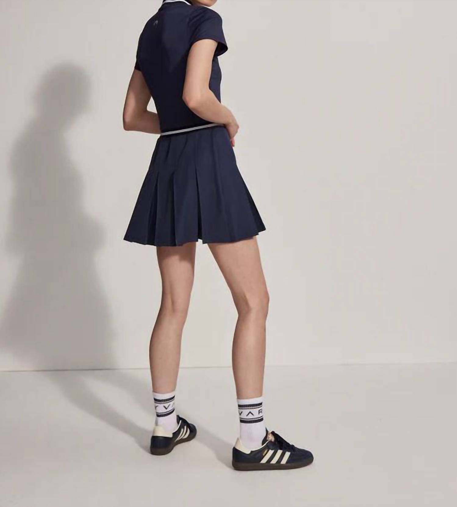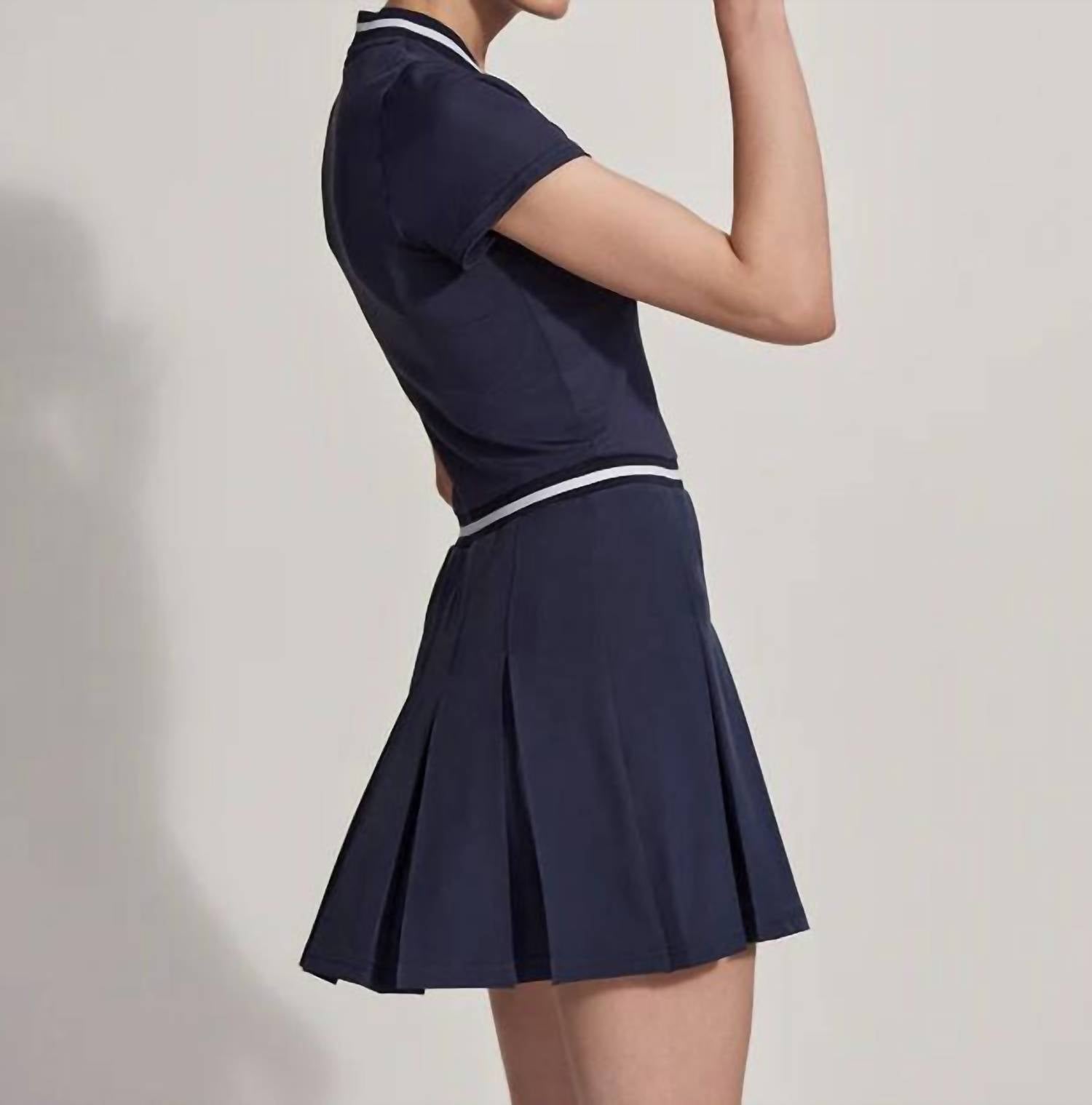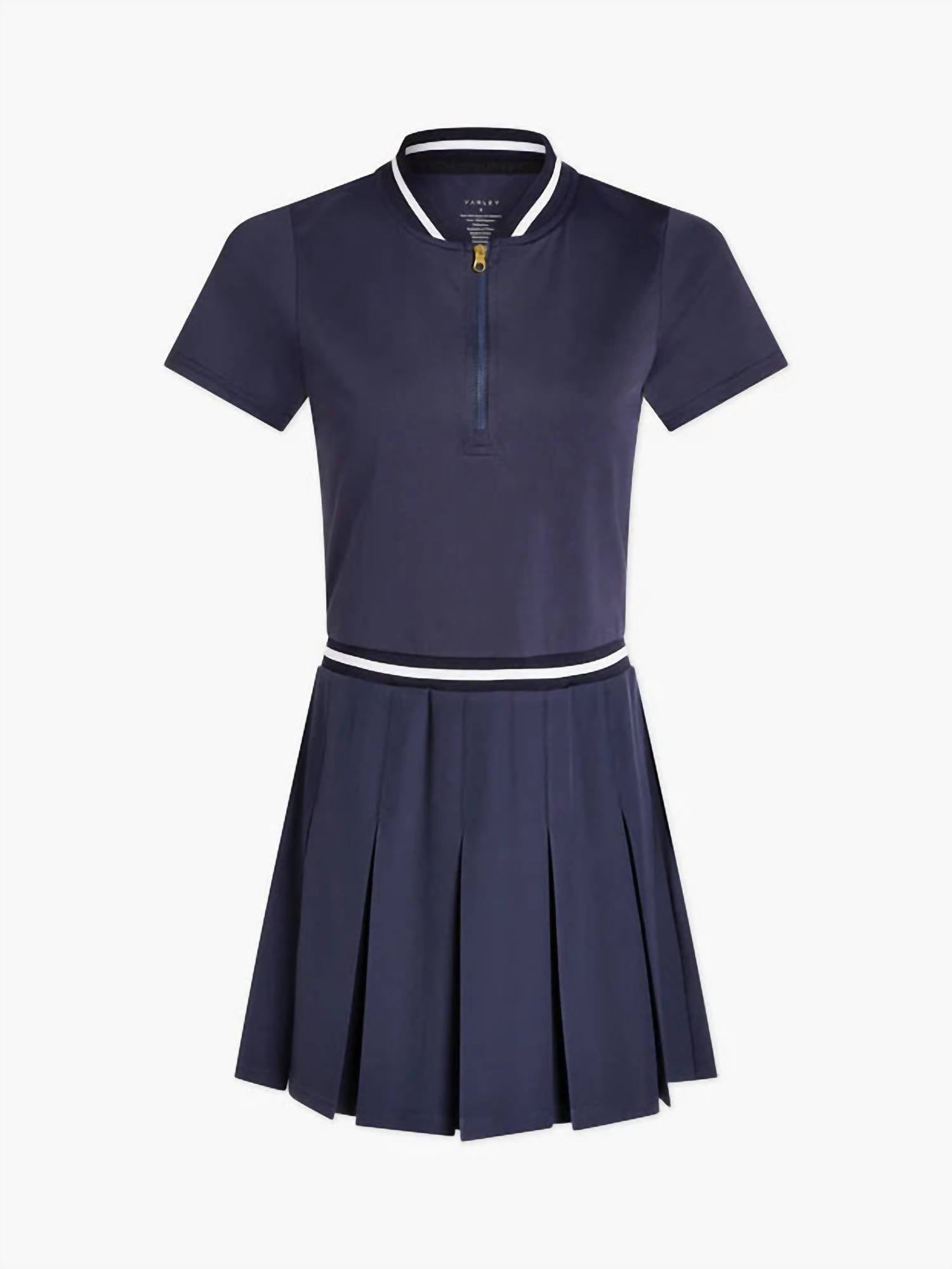 Introducing the Nora Court Dress by VARLEY, a stylish pick for Game Day in Blue Nights. This solid, short-sleeve dress features a figure-flattering A-line silhouette and a V-neckline for a chic, preppy look. Made from a nylon blend, this mini-length dress combines a Stretch Pique top with a Stretch Twill skirt for the perfect blend of comfort and performance. Closure: Zip closure. Care: Machine wash, line dry.