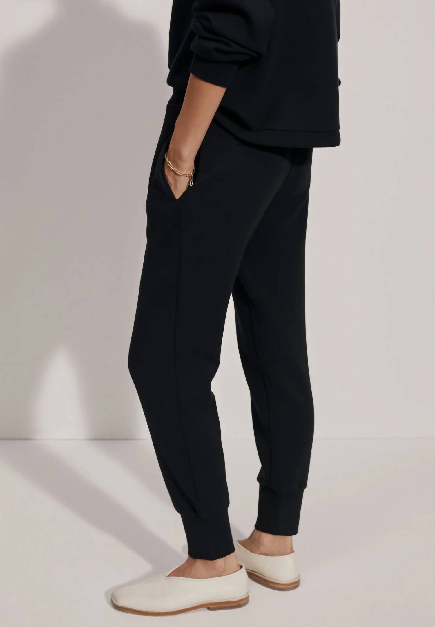 No gym necessary for these cool-girl joggers. Elevate your everyday style with the Slim Cuff Pant by VARLEY in timeless black, crafted from a cozy Viscose Blend for ultimate comfort. These solid regular-fit pants feature a tapered leg and a 27.5” full-length, making them the perfect choice for any casual yet stylish look. Closure is a convenient pull-on style with pockets included for practicality. Composition is 72% Viscose, 23% Polyester, and 5% Elastane. Care: Machine washable.