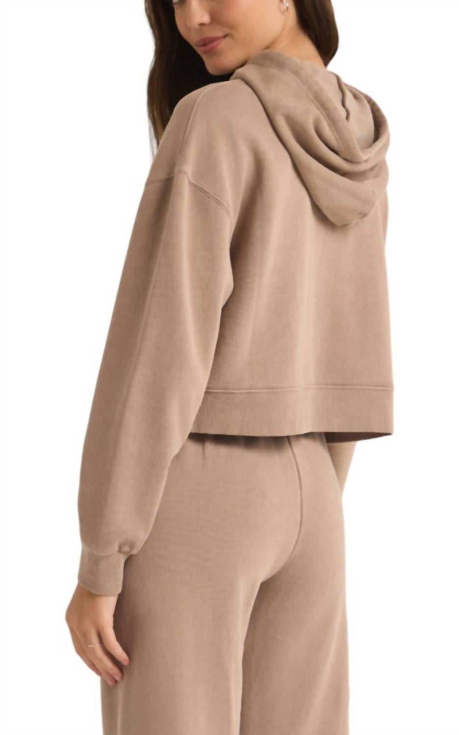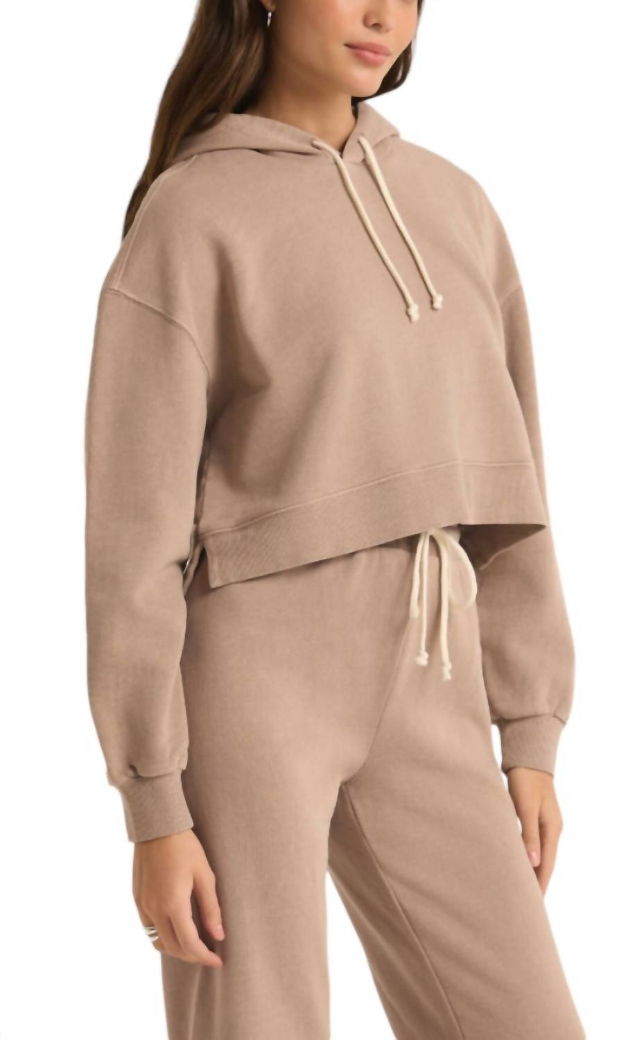 Cooler temps call for layering and we love this adorable sweatshirt for all the obvious reasons. Introducing the Jacobi Sweatshirt by Z Supply, a must-have in a chic latte hue for your casual wardrobe. This solid-colored women's sweatshirt features long sleeves and a comfortable hooded neckline, ensuring both style and warmth. Crafted from 100% cotton, it offers a cozy feel and a pull-on closure for easy wearing. Perfect for layering or wearing alone, this sweatshirt effortlessly complements any look.
