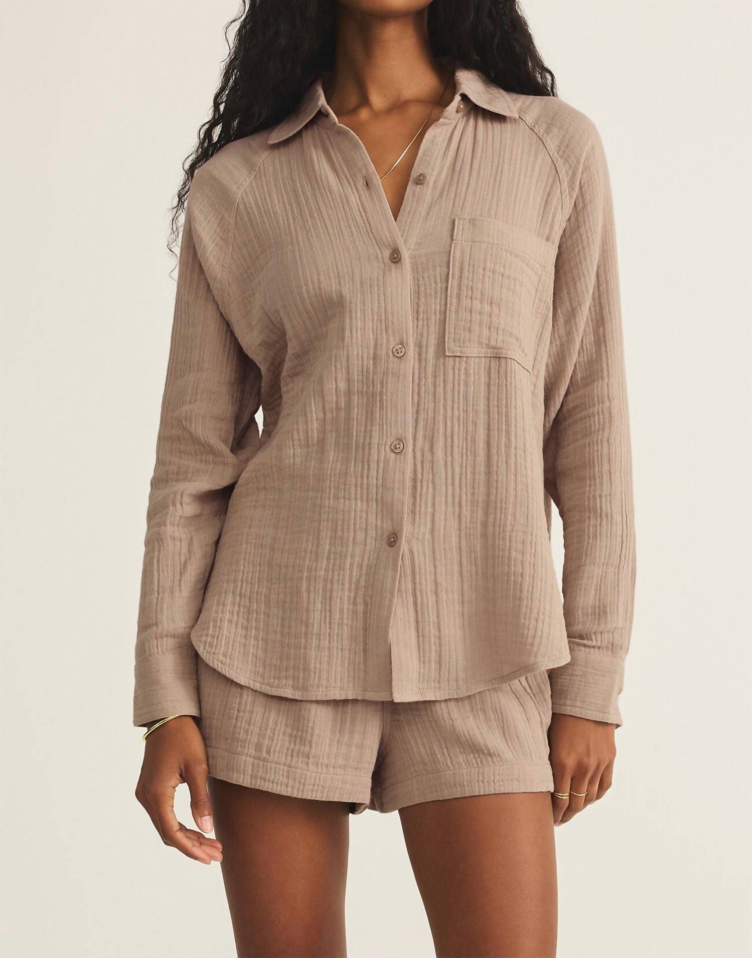 Perfectly tailored and soft to the touch. Experience the effortless charm of the Perfect Airy Top by Z Supply, a masterpiece in relaxed comfort. This long sleeve shirt, crafted from 100% cotton, provides the ultimate breezy feel with its soft and textured material in a delightful Iced Coffee hue. It features a classic collar, button closure, and convenient pockets for versatility and style. Made with care instructions in mind: machine wash cold, turn inside out, and line dry for best results.