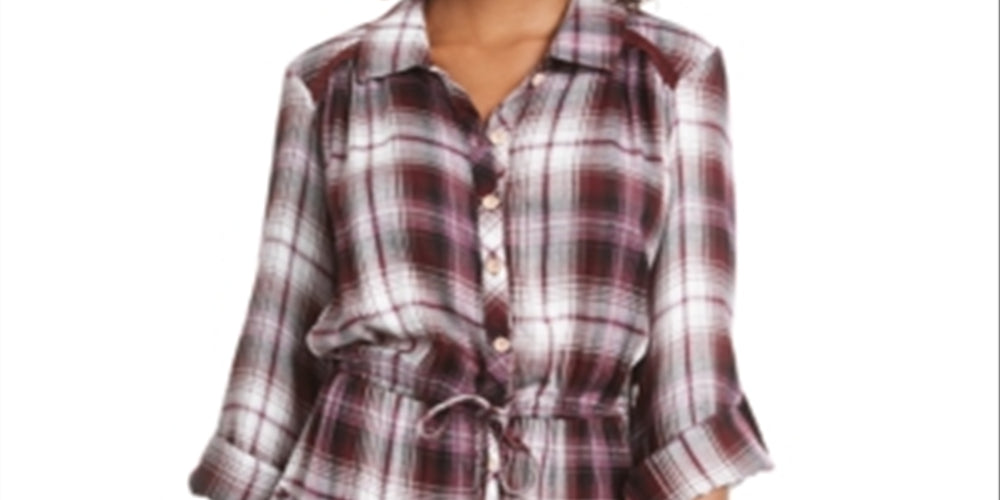 American Rag Juniors' Printed Roll-Sleeve Shirtdress Zinfandel Plaid Size XL