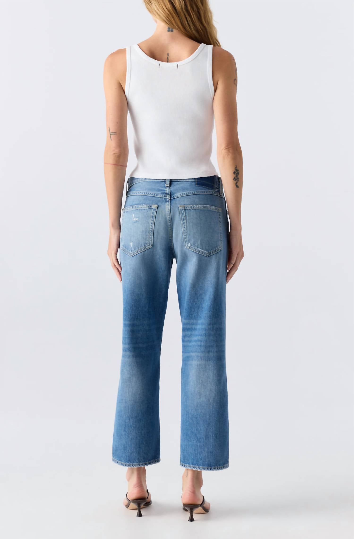 This cropped, wide straight-leg style offers an effortlessly relaxed fit with a mid-rise designed to sit low on the hips. Featuring thoughtful distressing throughout for a lived-in feel, it’s the perfect blend of comfort and casual style. Finished with a zip fly and crafted from 100% cotton.