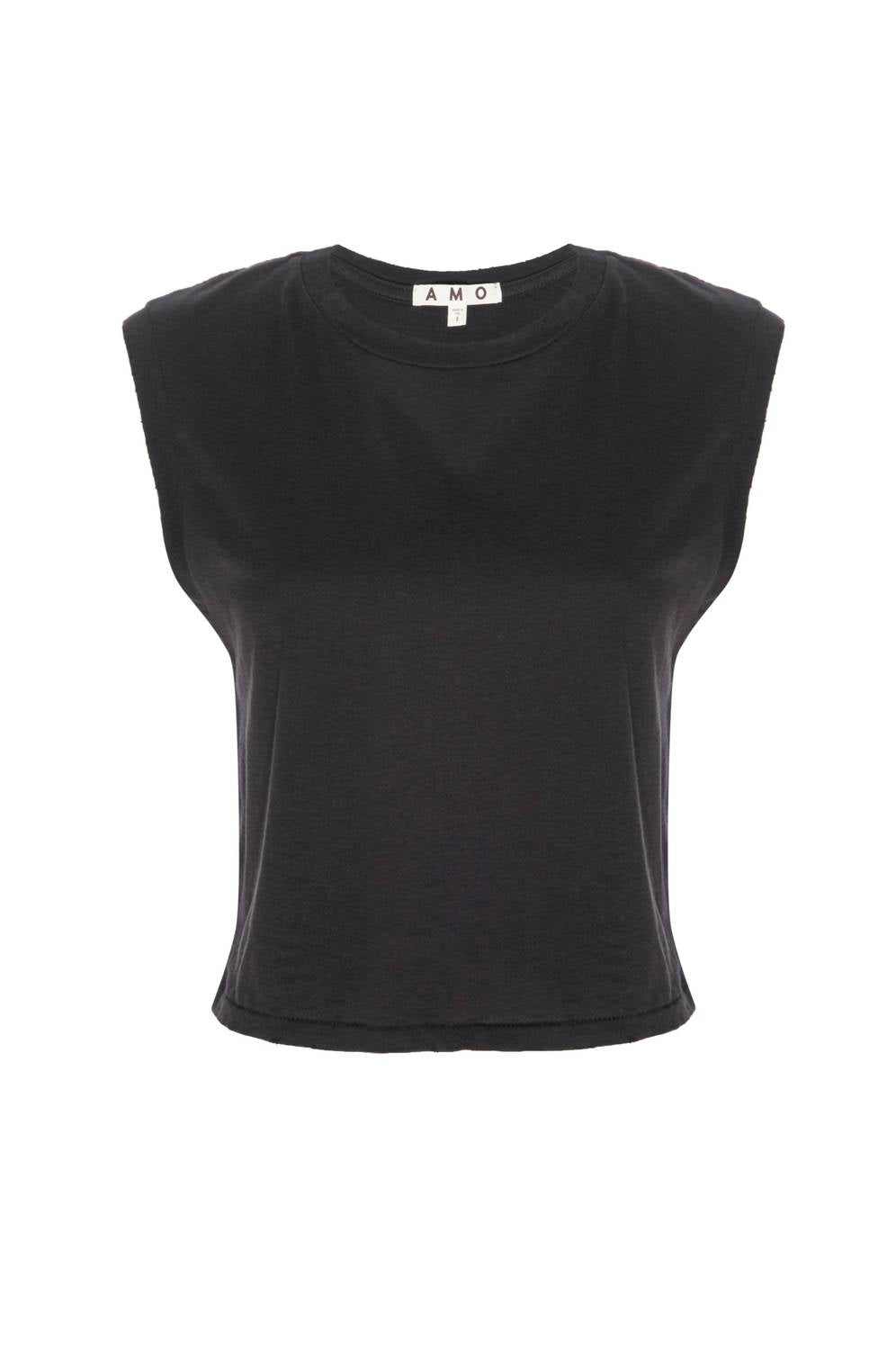 With so many ways to wear this, you'll want this muscle tee in every color. Introducing the AMO Denim Sleeveless Babe Tee, an essential in Vintage Black for a chic, laid-back look. This sleeveless tee, crafted from 100% Cotton, offers a cropped 19.5" length and features AMO's signature double needle side seam detail, tonal topstitching, and subtle distressing for a worn-in feel. Made with love in Los Angeles, it's perfect for pairing with high-waisted jeans or shorts. Pull-on. Machine wash cold, tumble dry low heat. Model Taliha is wearing size Small.