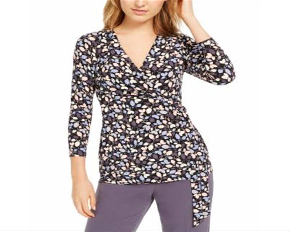 Anne Klein Women's Printed Tie-Waist Top Black/Blue Combo Size XXS
