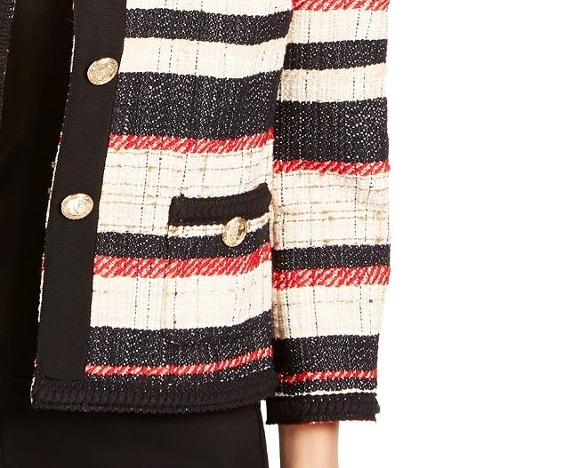 3/4-sleeves|Braided trim at neckline, front, sleeves, pockets and hem|Collarless; four-button closure at front|Imported|Two pockets at hips|Unlined