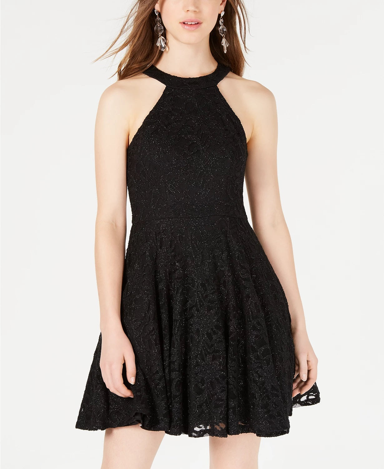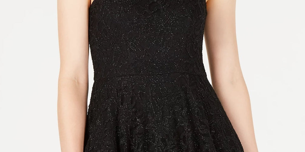 Partially open back with button closures at back of neck|Hits above knee|Halter neckline; fit & flare silhouette|Allover glitter lace; strap detail at back|Juniors' size XXS (00) = Women's XXS (00); Juniors XS (0-1) = Women's XS (0); Juniors S(3-5) = Women's S (2-4); Juniors M( 7-9) = Women's M (6-8)|Juniors' size L (11-13) = Women's L (10-12); Juniors XL (15-17) = Women's XL (14-16); Juniors XXL (19) = Women's XXL (18-20)