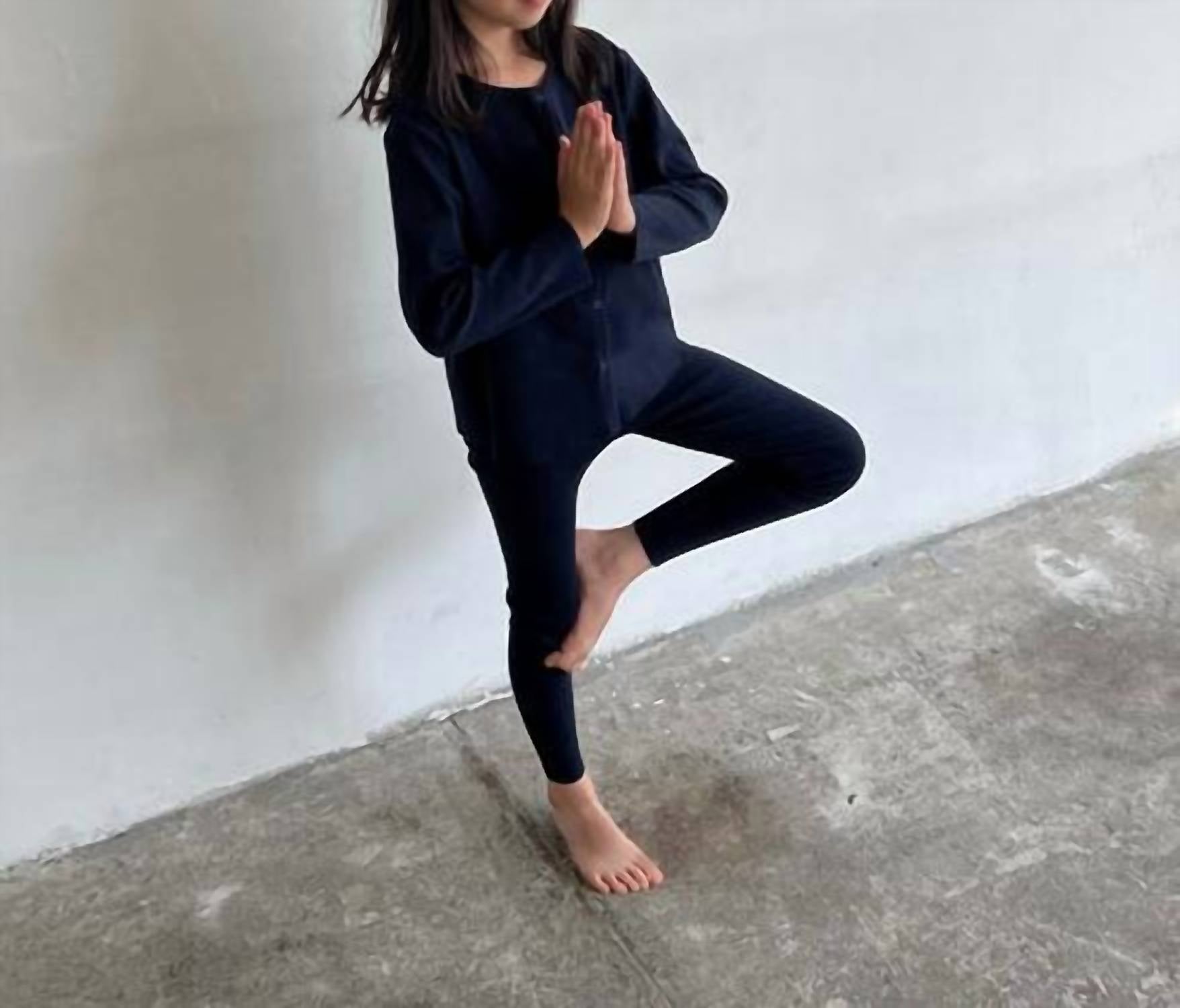 Introducing the Kid's Rib Leggings by A Basic Brand, crafted in a navy ribbed cotton blend for a snug and adaptable fit. Perfectly finished with raw hems, these unisex leggings are designed for active young ones and can be paired effortlessly with a matching rib sweatshirt for a complete look. Composition: 97% Cotton, 3% Elastane. Made in Poland. Care: Machine wash and line dry for easy maintenance.
