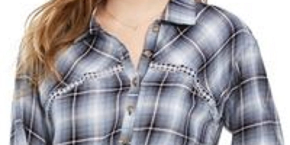 Point collar; button-front closure|Crochet-style openwork trim at front yoke; hemline tie at center front|Flared long sleeves convert to roll-tab 3/4-sleeves|Flared long sleeves convert to roll-tab 3/4-sleeves