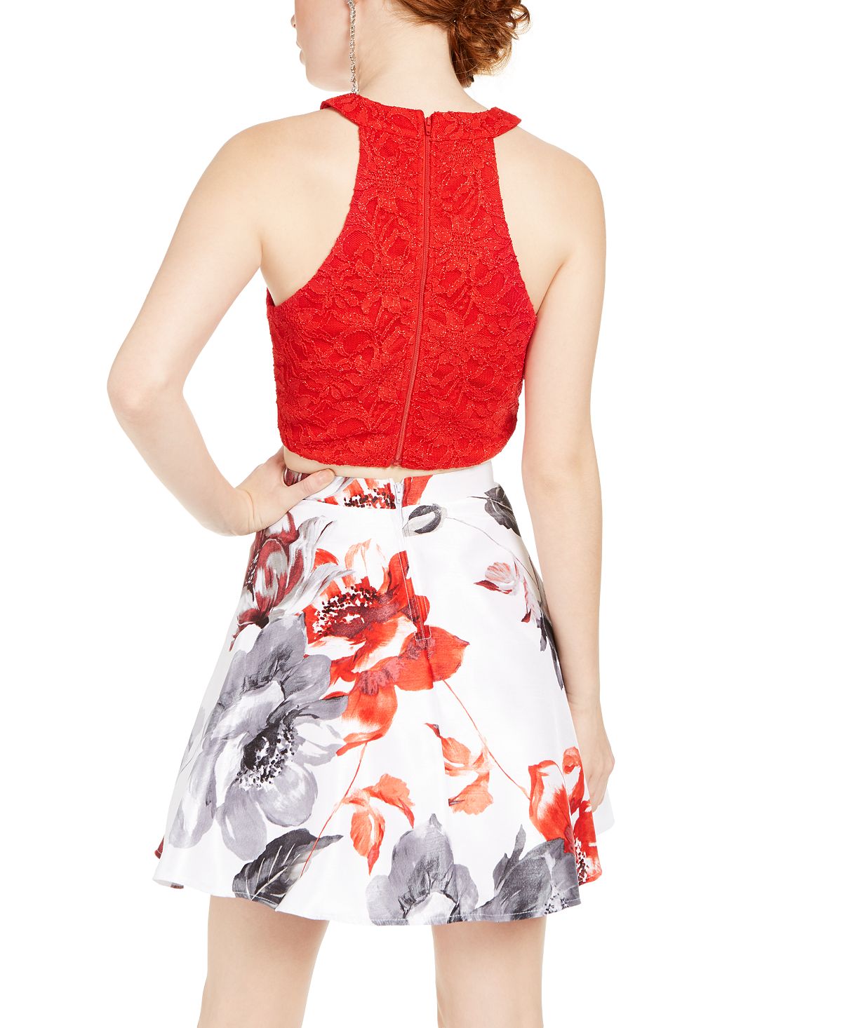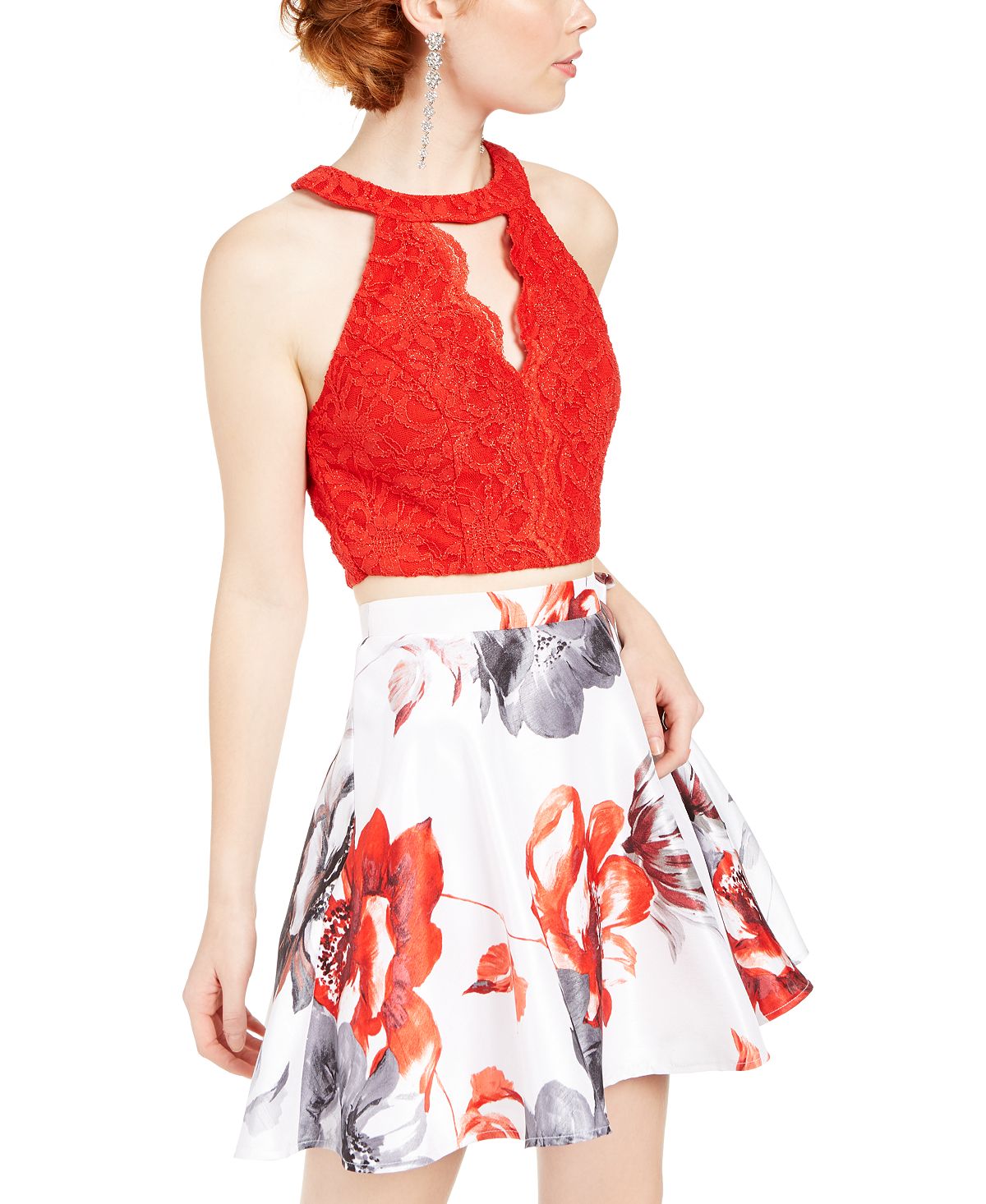 City Studios' two-piece dress is the life of the party in vibrant lace and a matching floral print.| Approx. 34-1/2 long from center back neck to hem. Length is based on size 7 and varies 1/4 between sizes| High neck with scalloped cutout; A-line silhouette| Hidden back zipper at top & skirt| 2-pc design; lace crop top; floral-print skirt| Bra cups