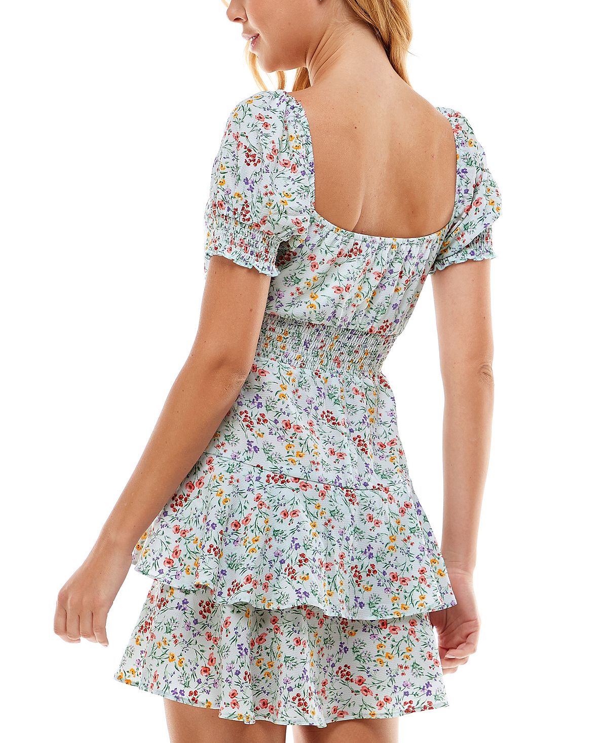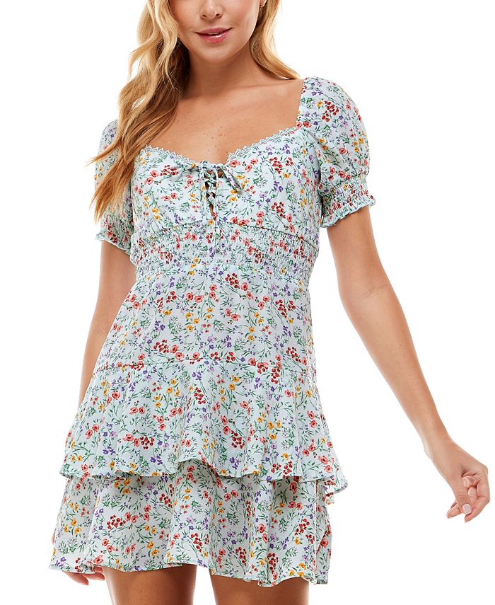 Pretty and peasant-inspired| a lace-up bodice is trimwith crochet lace atop a smocked waistline in City Studios' floral tiered dress that's brunch-ready and vacation-worthy.| Approx. 34 long from center back to hem. Length is based on size medium and varies 12 between sizes| Runs small; if between sizes| order one size up| Fitted through the chest and waist; flared and flowing skirt