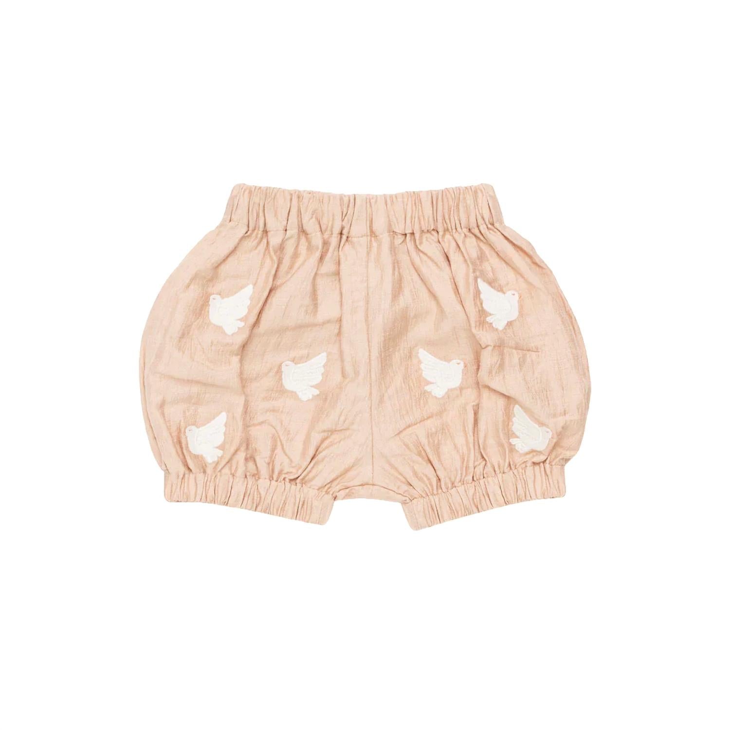 Introducing the Baby Merlin Bloomers by Donsje in a charming rose mocha hue, perfect for a little one's spring adventures. These shorts offer a comfortable fit with their elasticated waistband and leg openings. Made from 88% hemp and 12% polyamide, they feature embroidered embellishments that add a special touch. Care instructions advise a machine wash for easy maintenance.