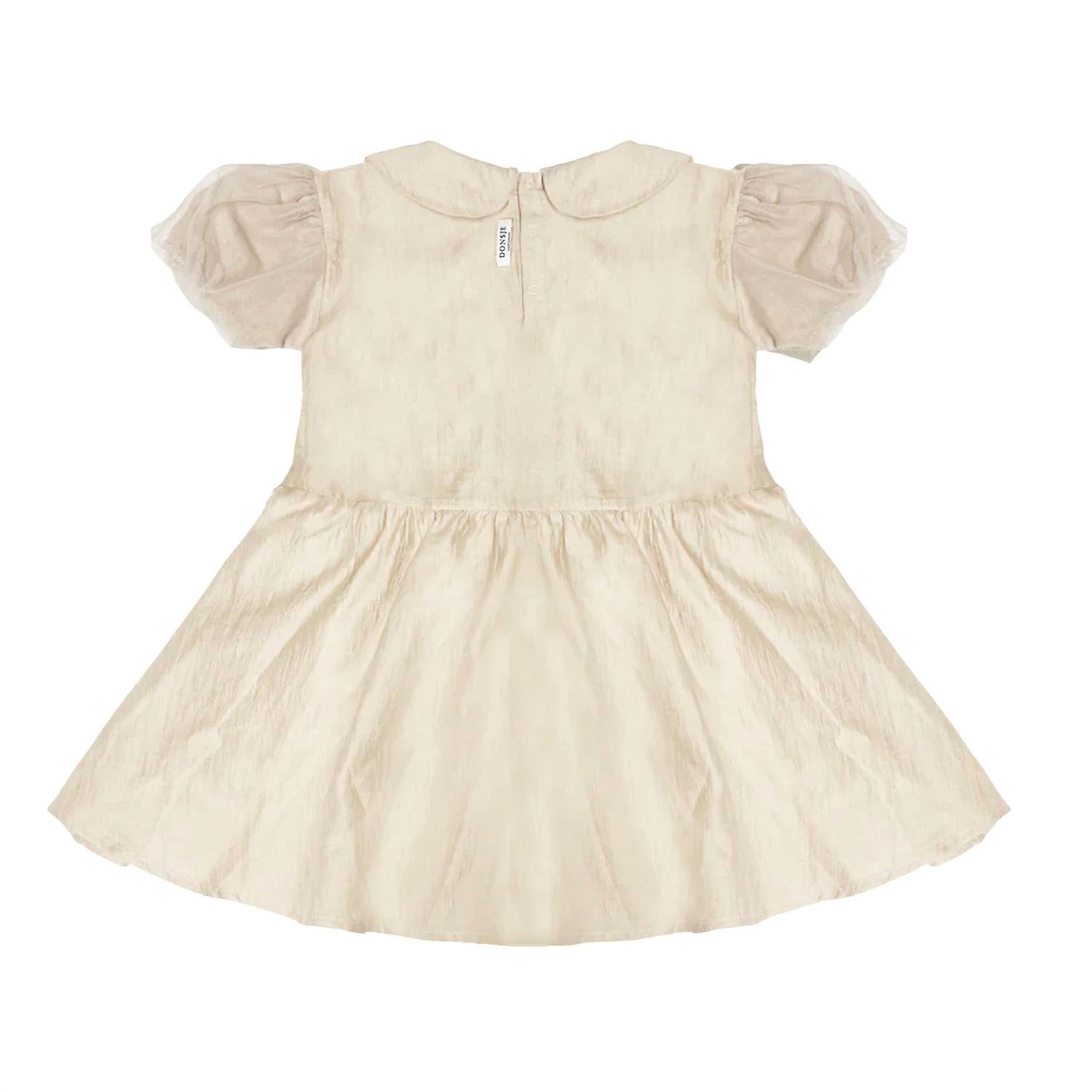 Introducing the Tulie Dress by Donsje, a captivating piece in a delightful biscotti hue, perfect for creating special memories. It features elasticated sleeves with a charming Peter-Pan collar and a delicate skirt design. Composition: Main fabric is 88% Hemp and 12% Polyamide, with detail in 100% Polyester. Closure: Snap fasteners along the back.