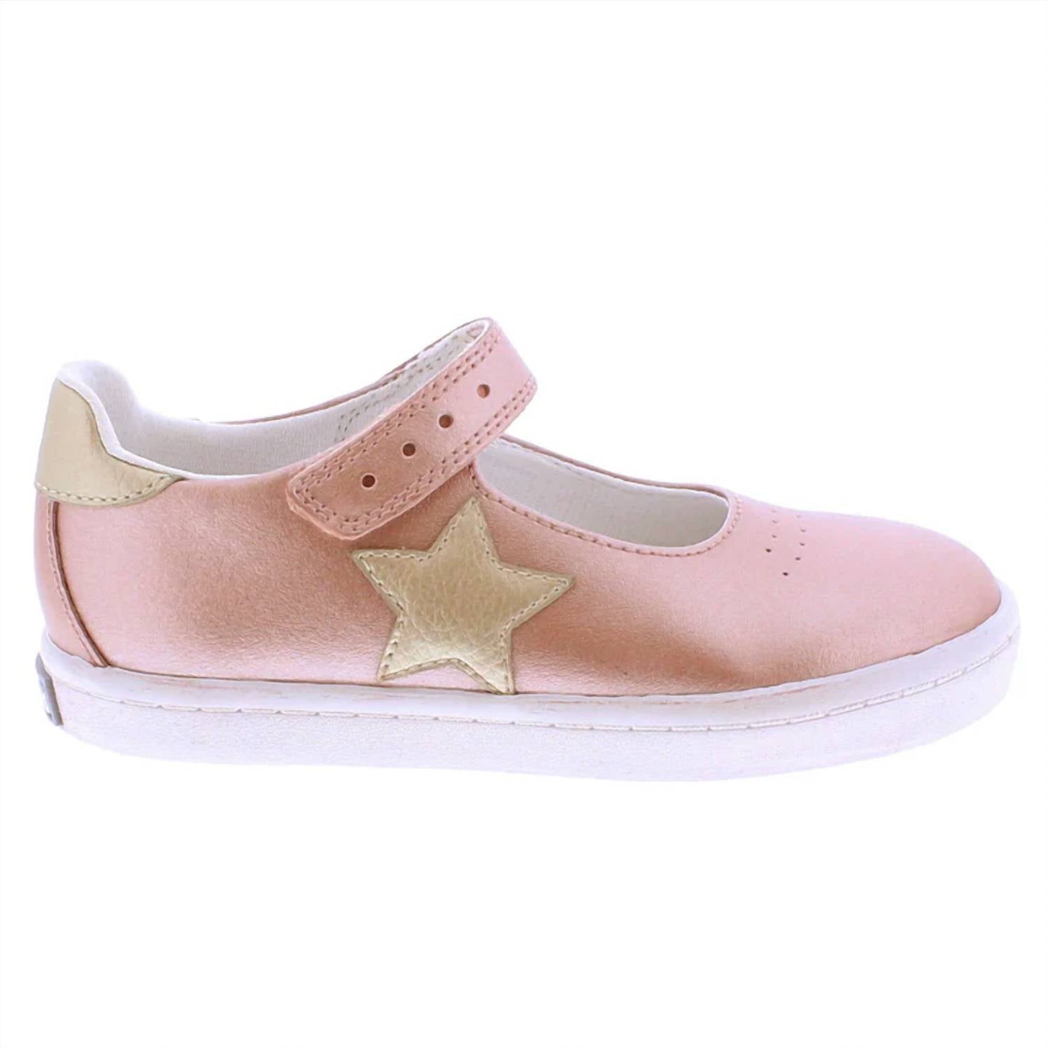 Decorative star applique and perforations, with an antique finish on outsole profile. Custom fit system. Removable, dual insoles in Medium and Wide provided for customized fitting. Roomy toe box. Allows tiny toes room to breathe and splay naturally during walking, enhancing balance and reducing rubbing, friction, and moisture. Arch support. Shoe last and insole designed to provide proper arch support for developing feet. Firm heel counter. Provides stable lateral support for new and confident walkers alike, improving balance, support, and posture. Padded collar for comfort. Breathable textile lining and cushioned textile foot-bed for all-day comfort. Single strap hook & loop closure for adjustability and secure fitting. Flexible, slip-resistant vulcanized rubber outsole. Provides maximum flexibility, shock absorption, stability and slip-resistance for safety and comfort. Non-marking outsole.