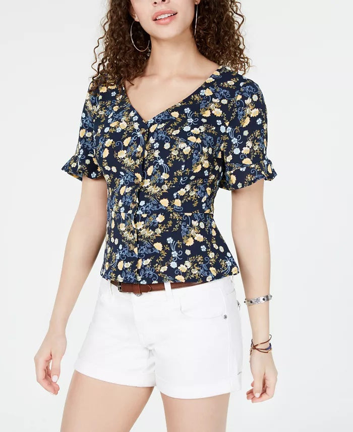 Hooked Up By Iot Juniors' Printed Peplum Blouse Navy Size Large