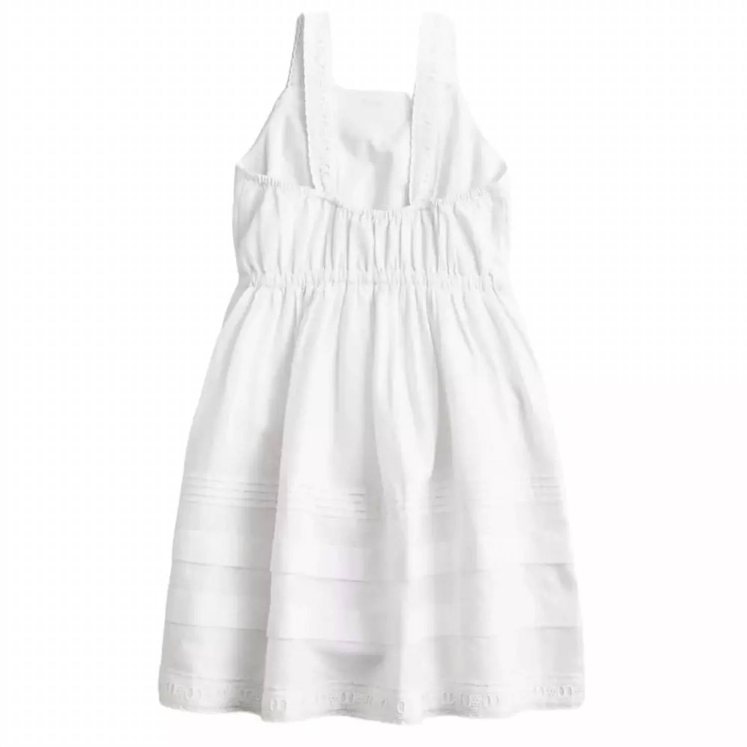 Introducing the Girls' Eyelet Apron Dress by J.Crew, a charming blend of elegance and comfort perfect for casual occasions. Composition: 60% linen, 40% cotton, lined for added comfort. This dress falls elegantly above the knee and features delightful details like eyelet trim, tiers, and ribbon stitching. Designed with an elastic waist for ease, it is machine washable for convenient care. Color: White. Pattern: Solid. Ideal for girls who love a stylish yet effortless look.