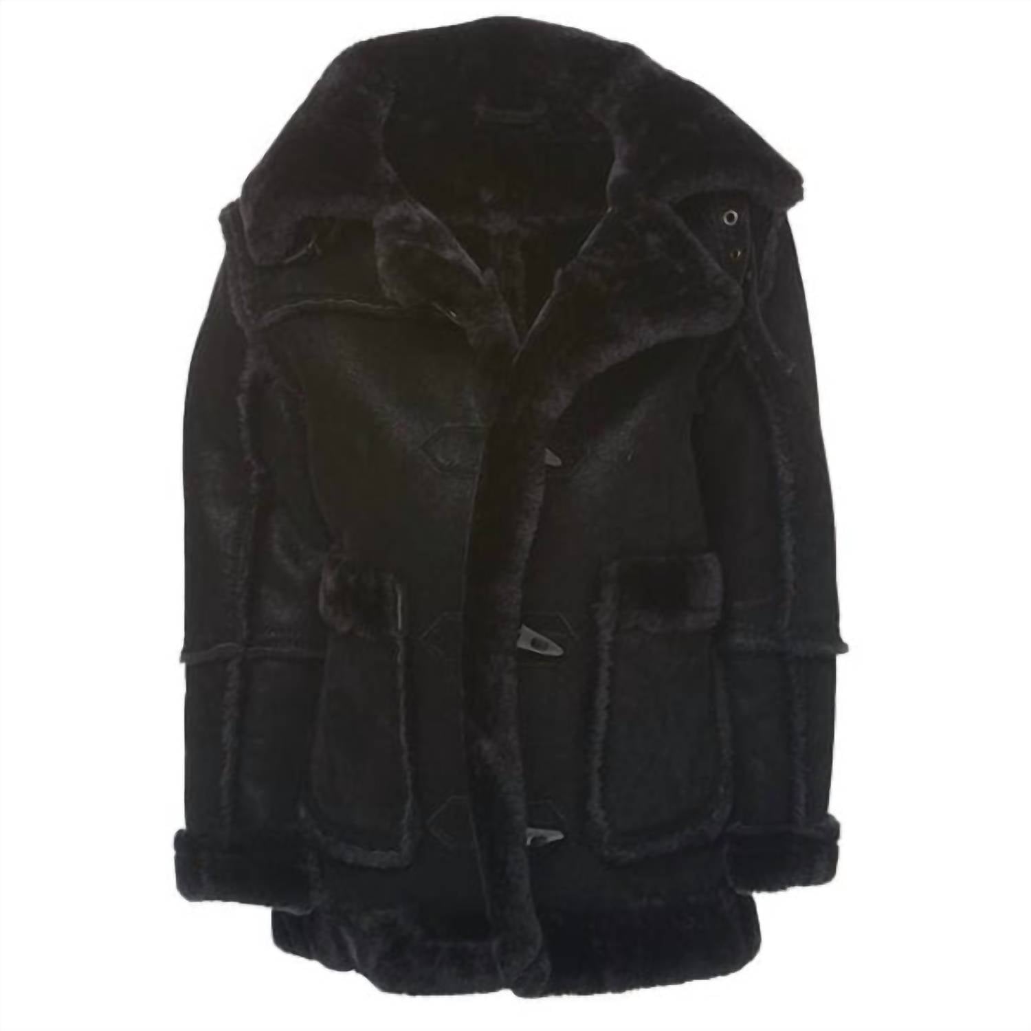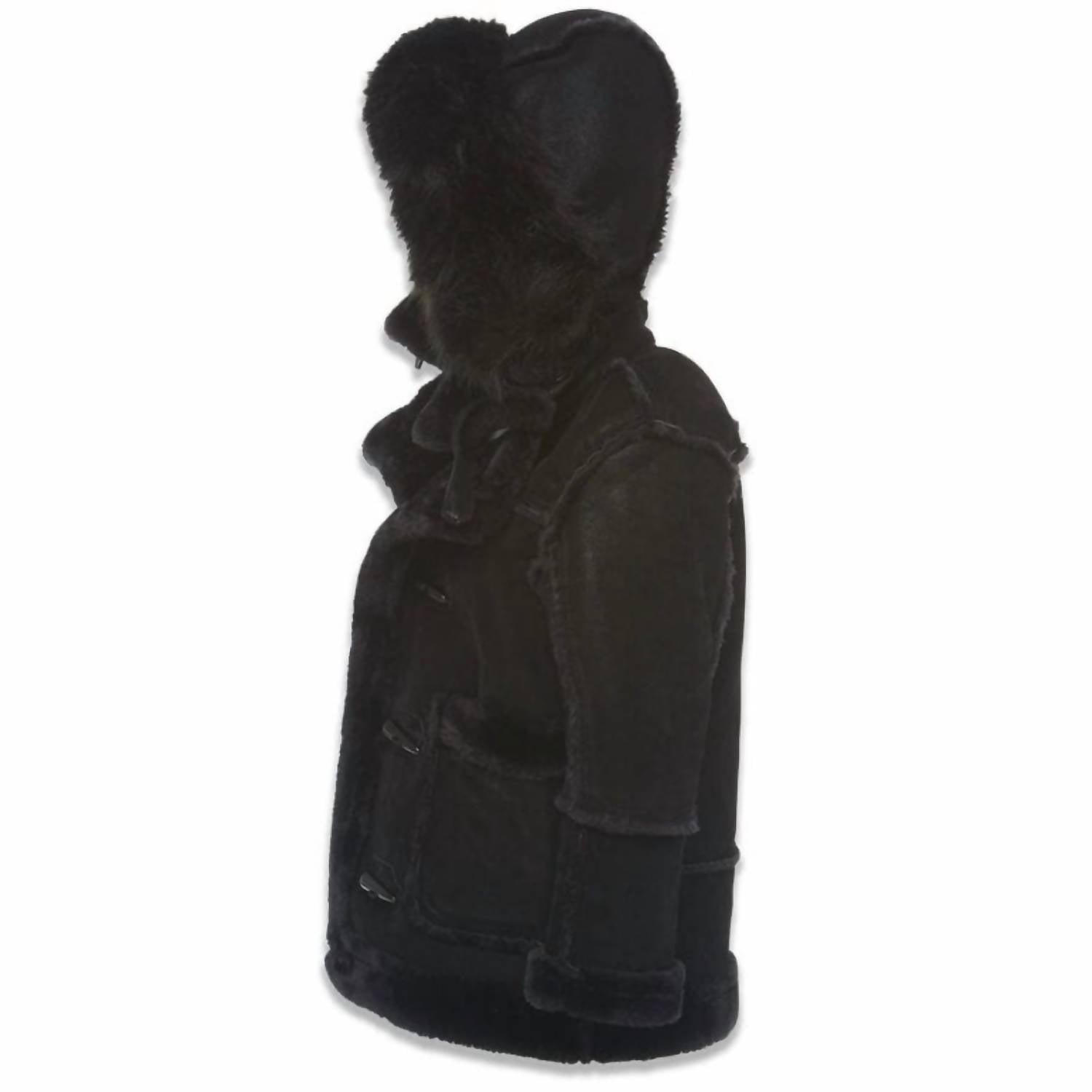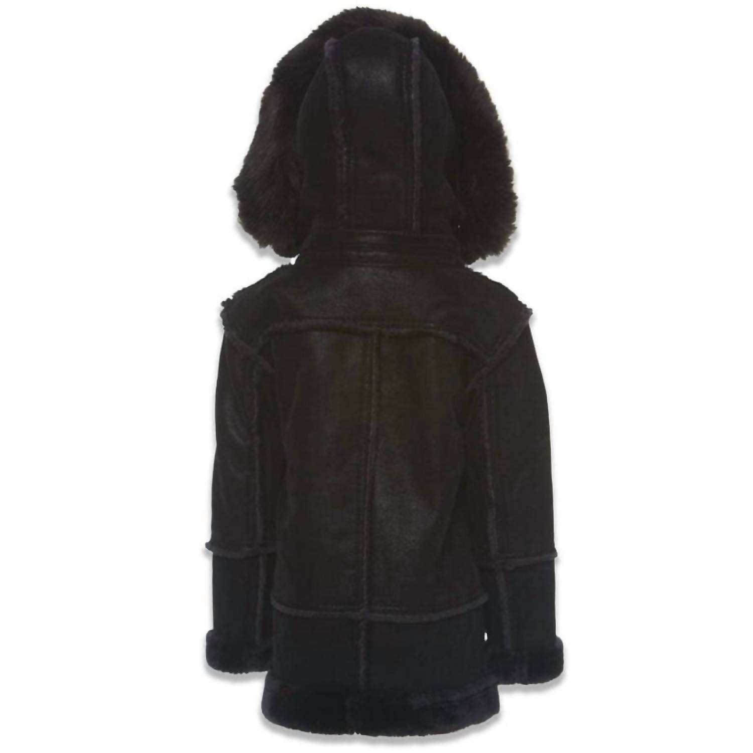 Perfect for your little one's winter wardrobe. Stylish piece features plush faux shearling lining throughout, offering warmth and comfort with accented shearling pockets and a horn toggle front closure. Crafted from a faux suede body with vegan suede straps and a buckle at the neck, also comes with a detachable faux fox fur hood for versatile wear. Care instructions: Hand wash this jacket to maintain its quality and texture.