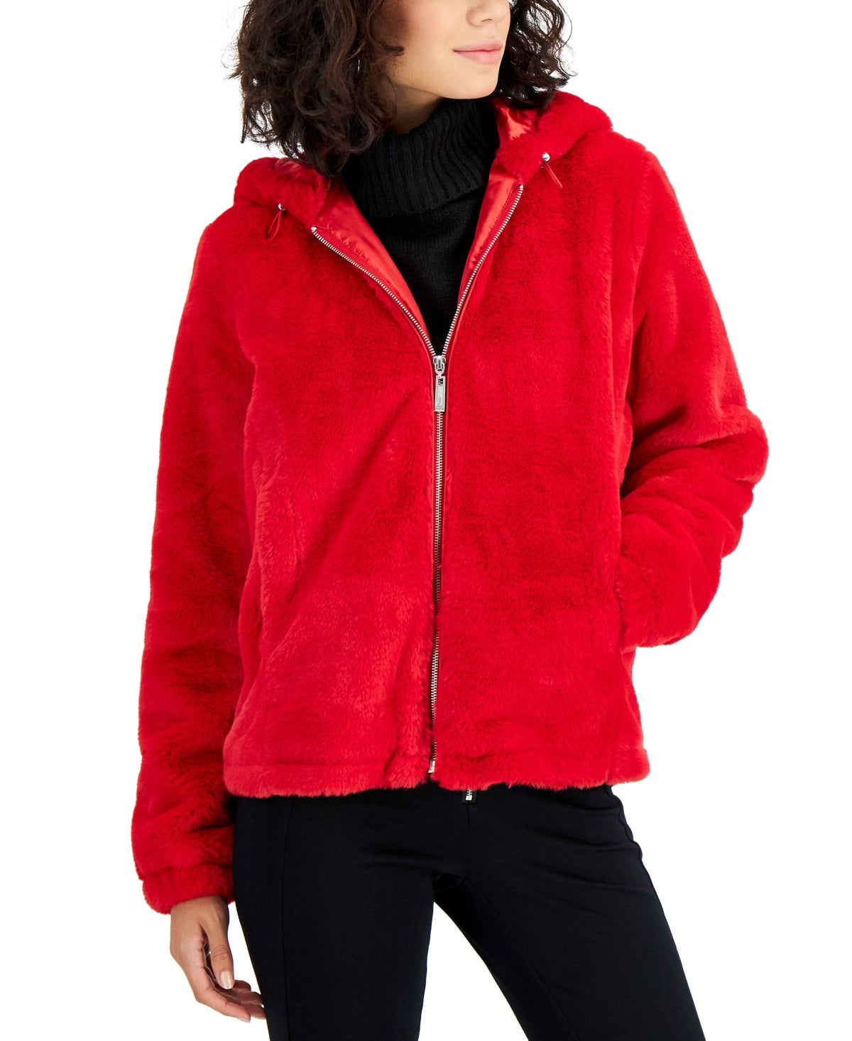 Jou Jou takes any outfit to the next level with this faux-fur coat designed with a cute hood and two side pockets