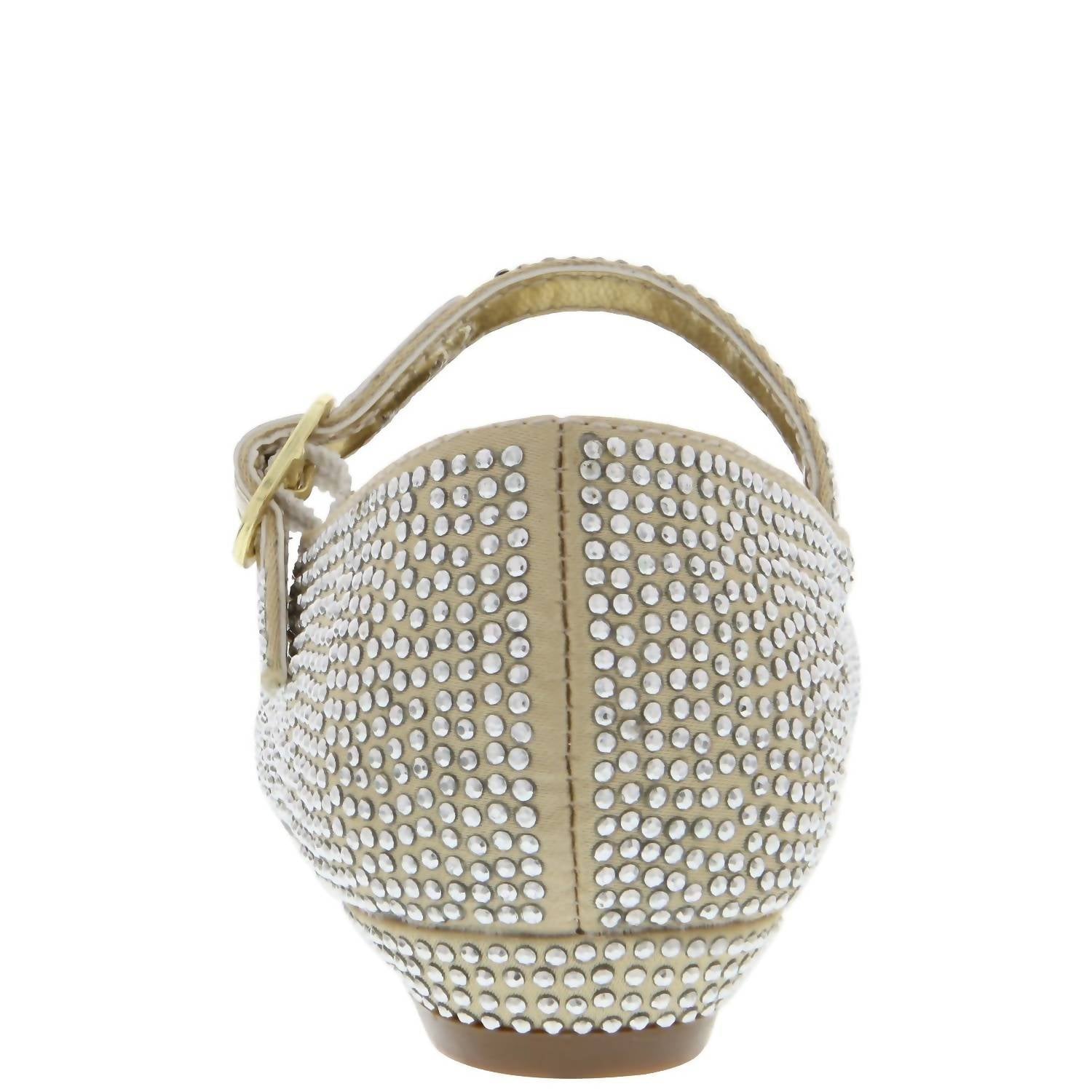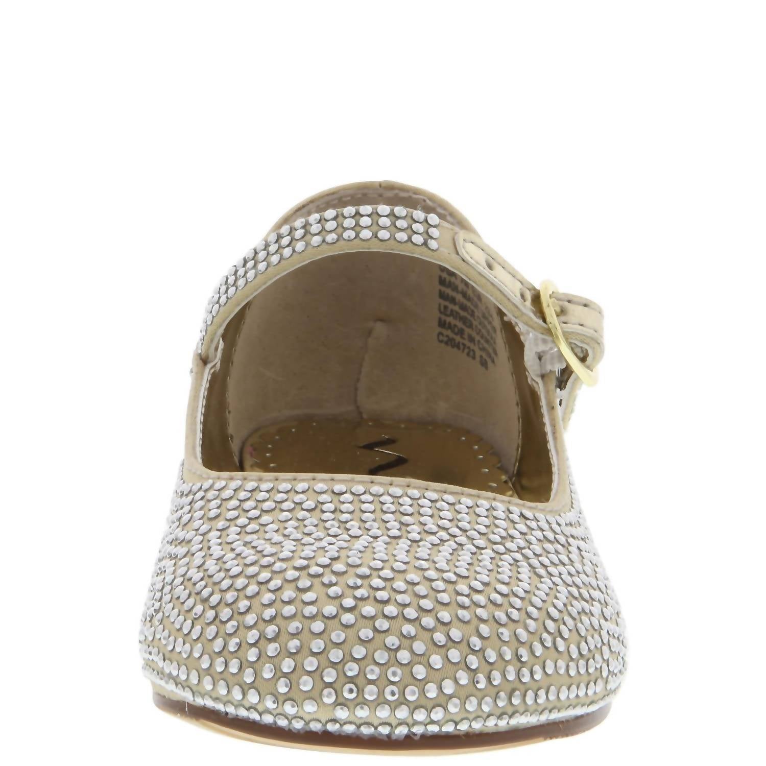 Elevate your toddler's celebration attire with the Girls Zelia Toddler Dress Shoe by Nina Kids. This gold satin shoe, adorned with charming studs, features a block heel of 1.25 inches and a round toe silhouette, perfectly blending playful style with comfort for her medium-width feet. Designed for special birthday or Thanksgiving occasions, this vintage-inspired shoe is ideal for the fall season. Easy to wear and undeniably cute, these dress shoes ensure your little one stands out while having fun.