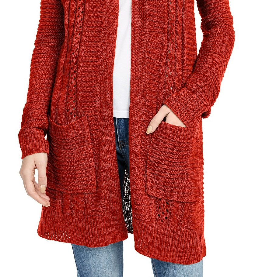 Approx. model height is 5'10" and she is wearing a size medium|Relaxed fit|Open front with no closure|Mixed knits with eyelet detail; two patch pockets|Runs small, we suggest sizing up for the perfect fit|Acrylic/cotton|Hand wash cold