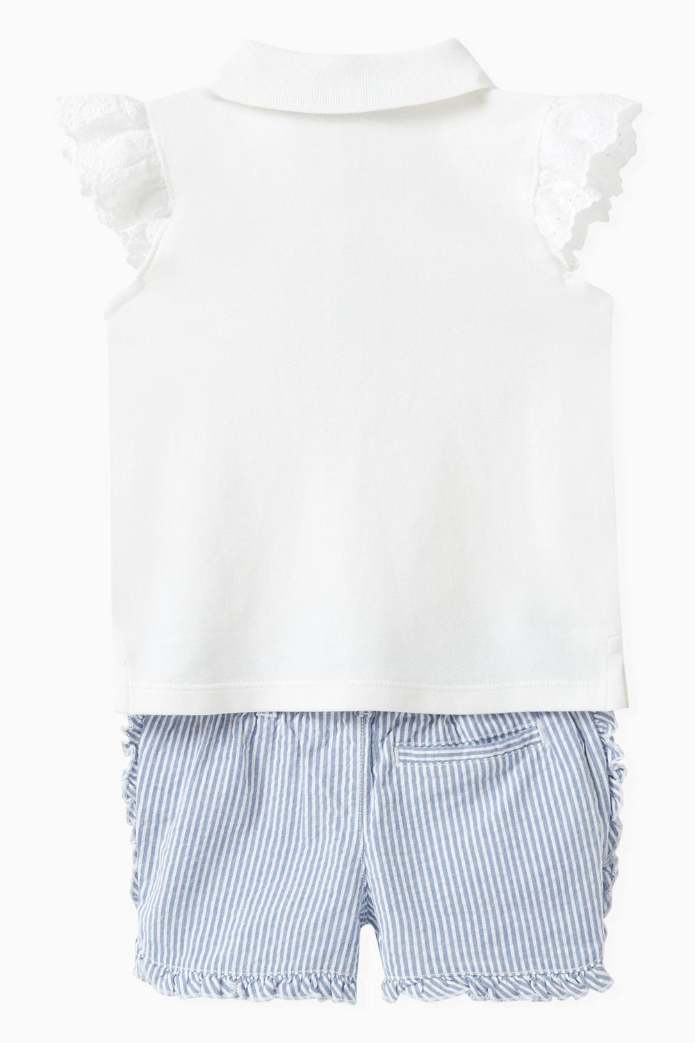 Introducing the Girls Ruffle Sleeve Polo and Short Set by Polo Ralph Lauren, a charming ensemble in a solid white and navy. The set is crafted from 100% cotton, ensuring comfort for daily adventures. The top features ruffled sleeves and a front button closure, while the shorts include a front button, elasticated waist at the back, and ruffle trims for added flair. Care is simple: machine wash at 30°C.
