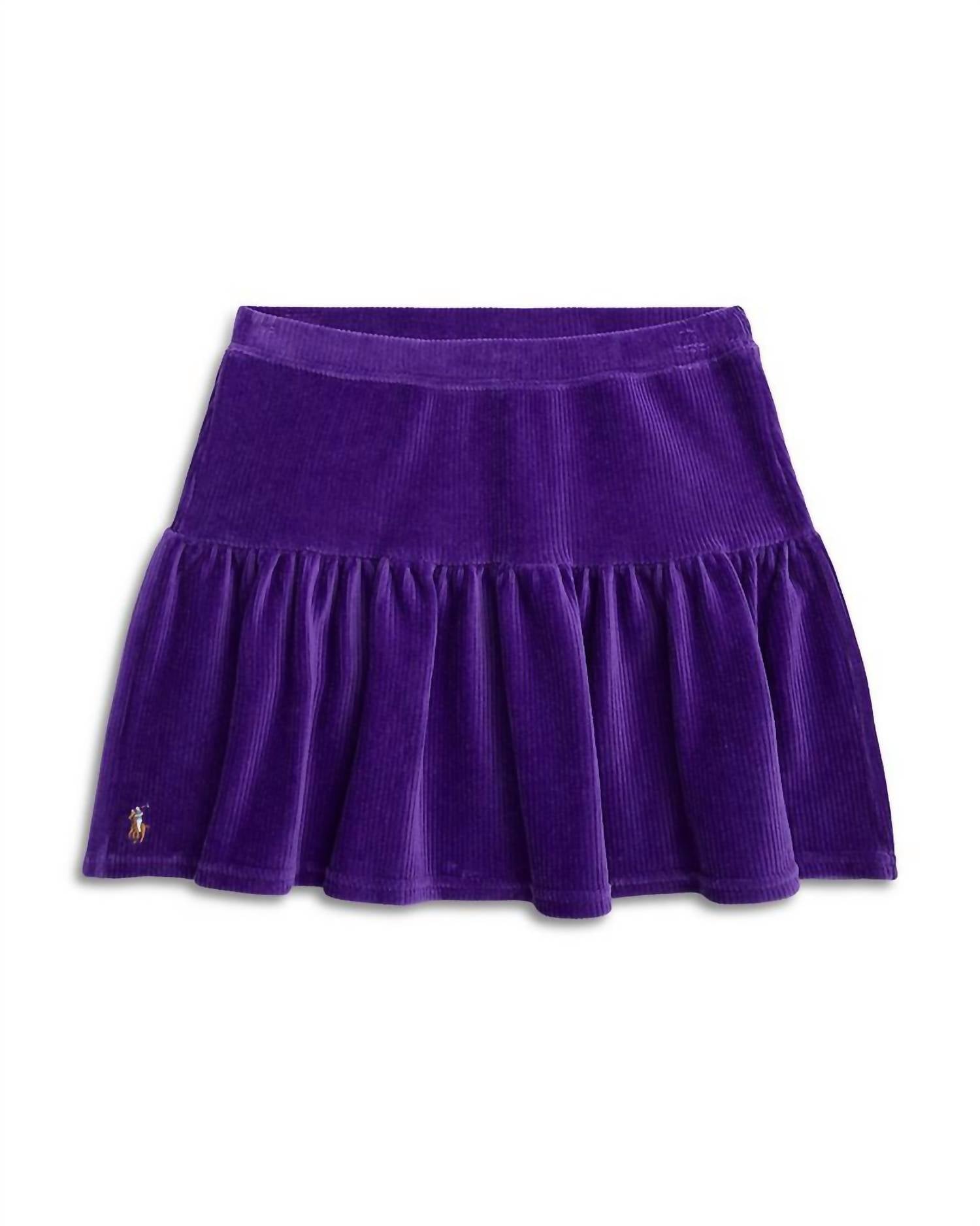 Elevate your little one's wardrobe with the Girls Tiered Corduroy Skirt by Polo Ralph Lauren, crafted in a stylish purple hue. This comfortable skirt features an elasticized waistband and a charming shirred tier, made from a stretch-blend corduroy composed of 63% cotton, 33% polyester, and 4% elastane. Adorned with Polo Ralph Lauren's iconic multicolored embroidered Pony at the right hem, it's a standout piece. Care instructions recommend machine washing to keep it looking fresh.