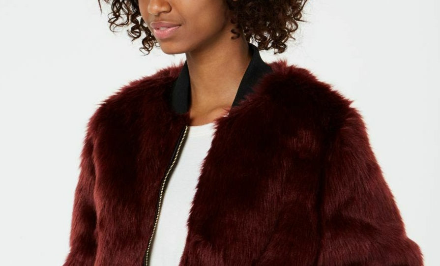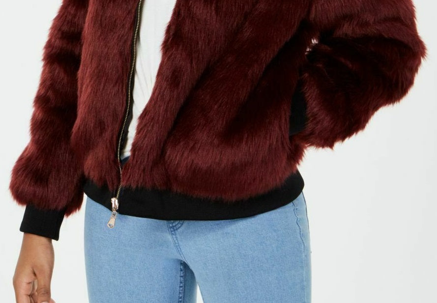Polyester|Point collar; front zipper closure|Allover faux fur; ribbed at cuffs and hem|Runs small, we suggest sizing up for the perfect fit