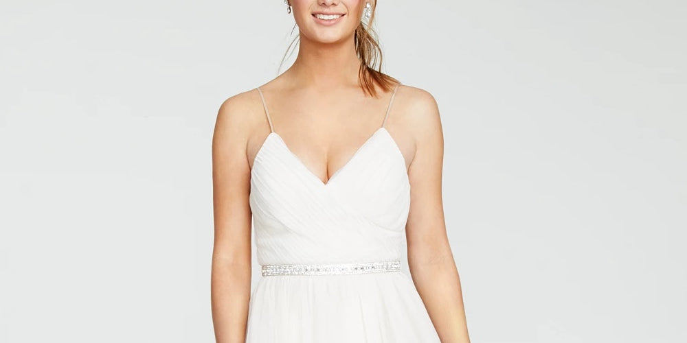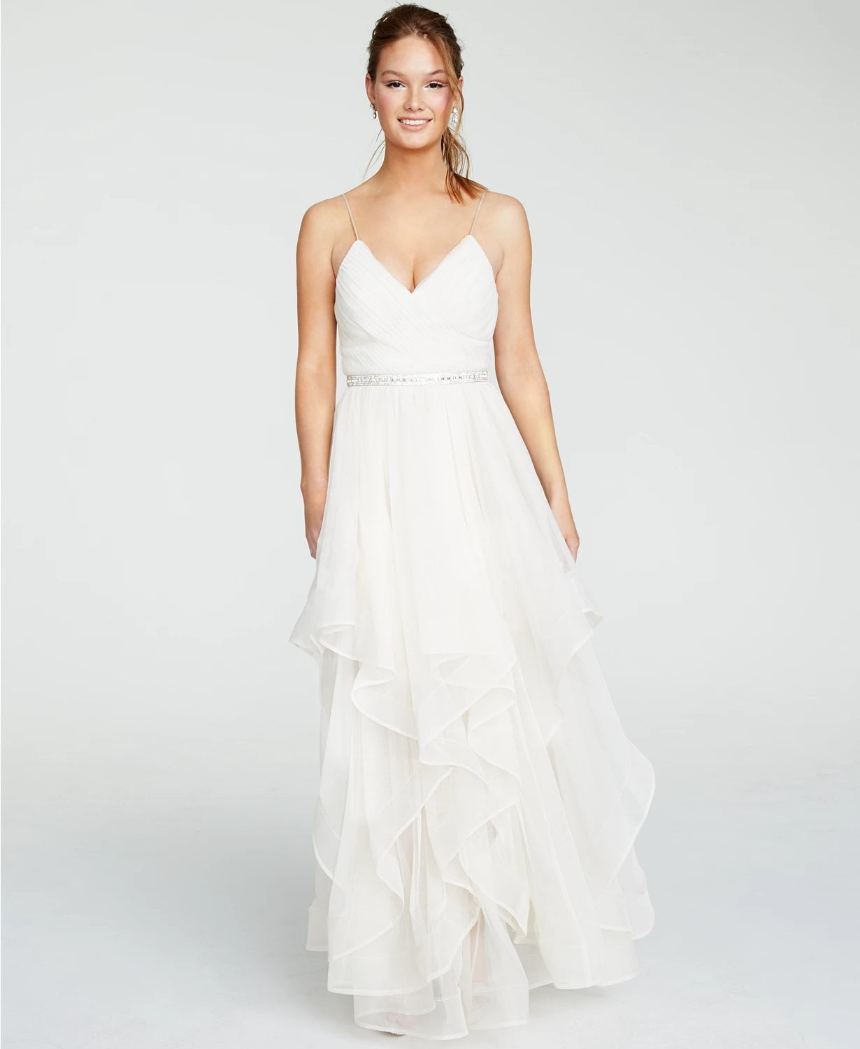 Approx. 60" long from center back neck to hem. Length varies 5/8" between sizes|V-neck; Ball gown silhouette|Hidden zipper closure at center back|Adjustable straps|Crisscross ruching at bodice front; low scoop back; rhinestone belt at waistline; ruffled tiered skirt