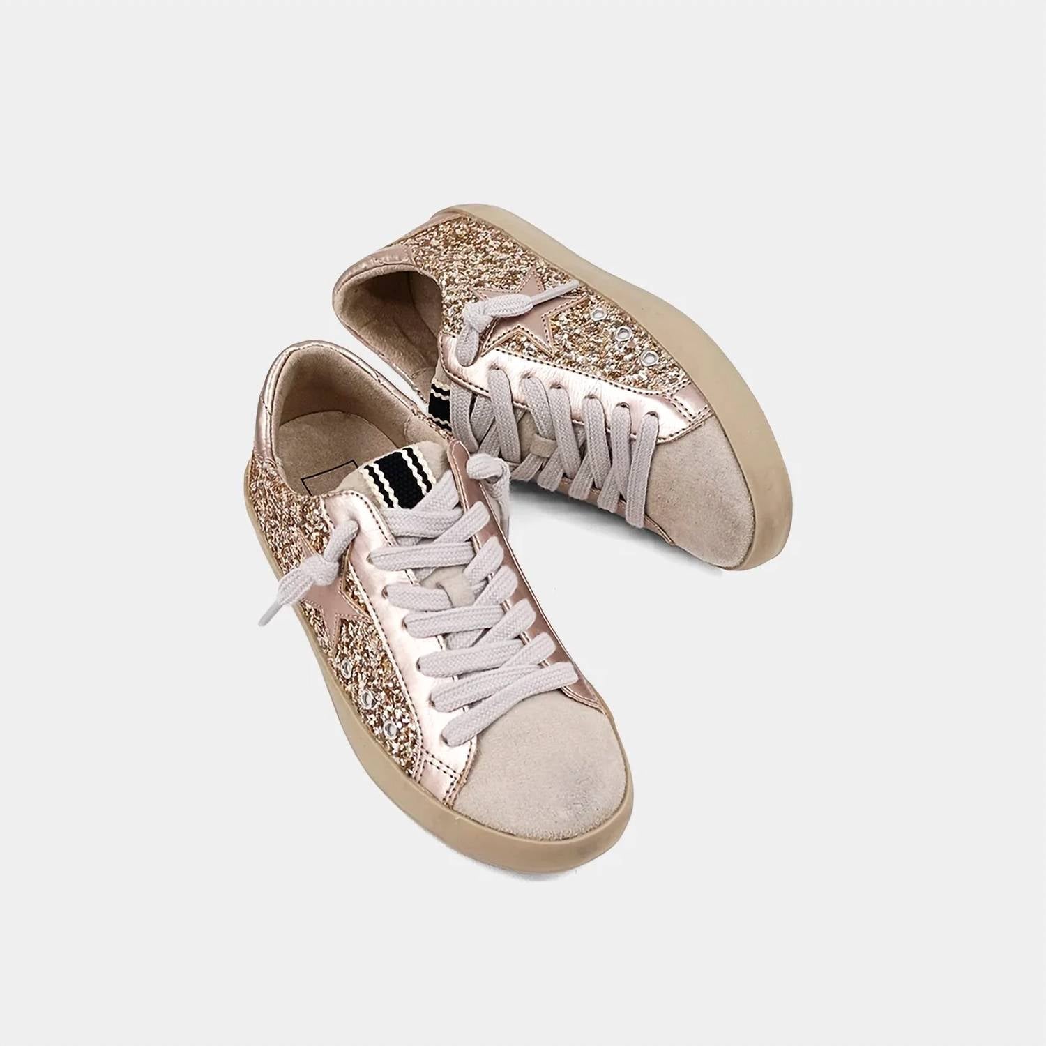 Stylish sneakers seamlessly combine vintage charm with contemporary flair. Crafted from high-quality faux leather and suede. Adorned with eye-catching metallic and feature the iconic star. Classic round toe design paired with a sturdy waffle rubber sole. Ensures that your child's comfort and durability are never compromised. Blending fashion and function in one enchanting package. Designed with little ones in mind, these sneakers are an essential for any kid who loves to shine.