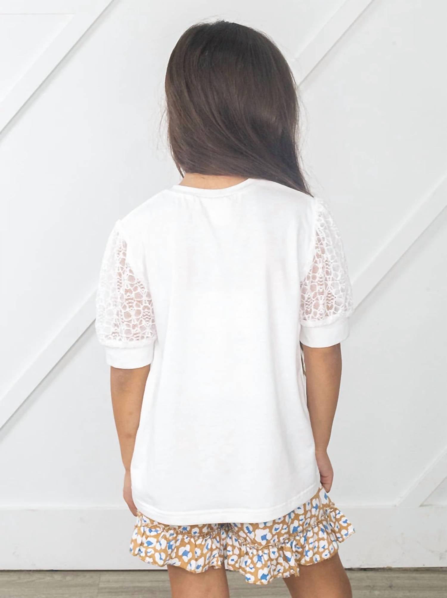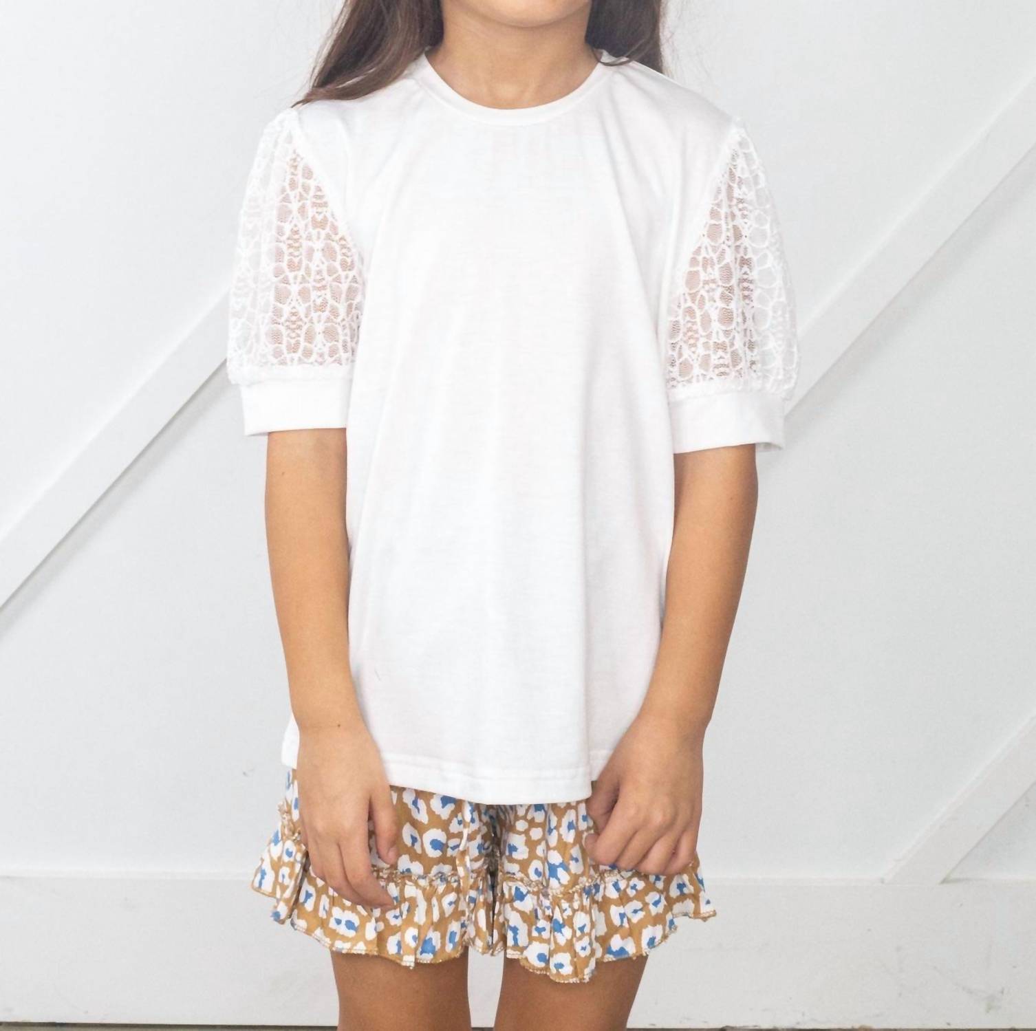 Southern Grace Girl's Just Like Mama Lace Sleeve Top in white is available in sizes 2-3Y, 4-5Y, 6-7Y, 8-10Y, and 10-12Y. Made from 65% cotton, 30% polyester, and 5% spandex, it offers a true-to-size fit.